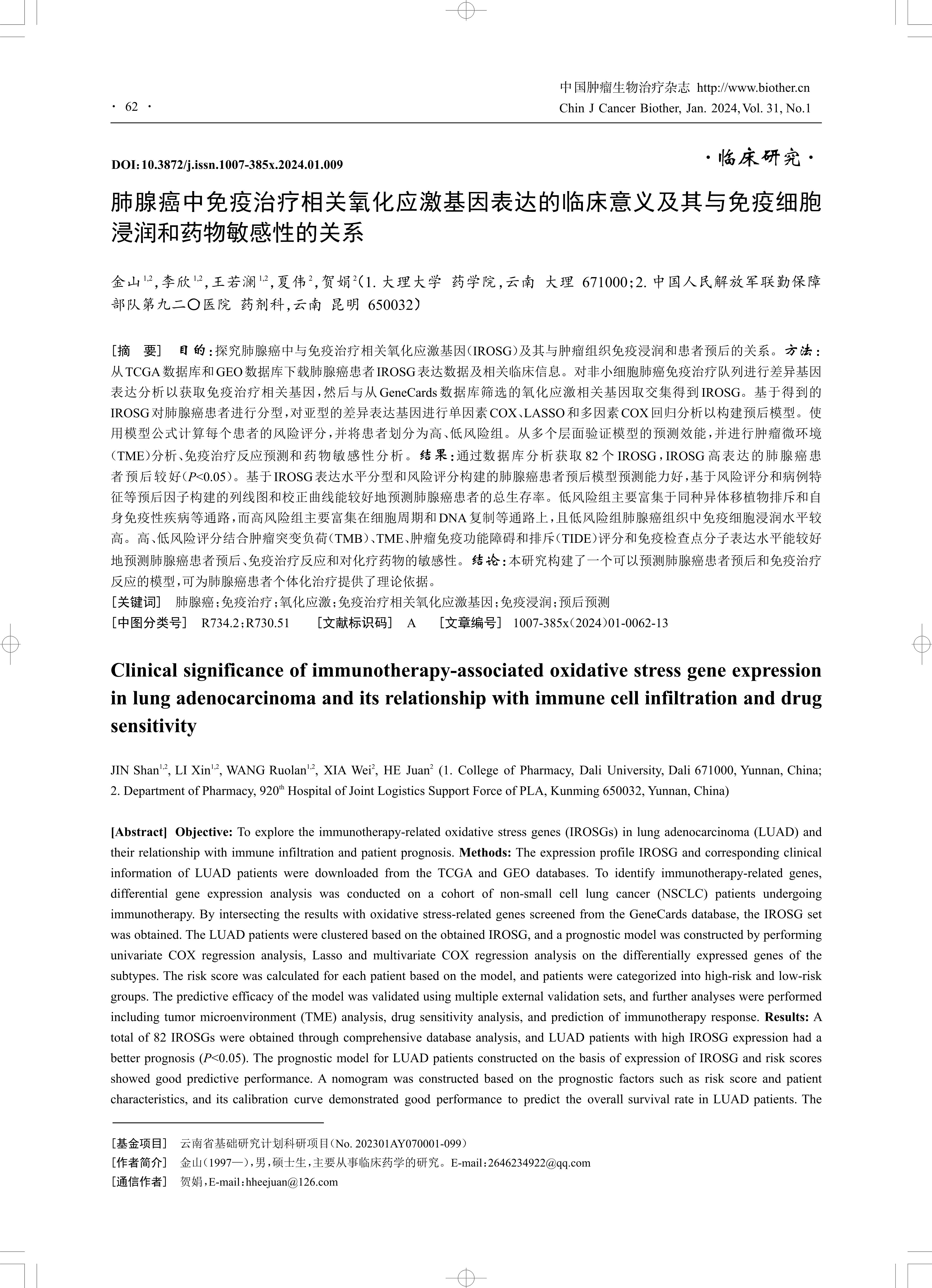 目的:探究肺腺癌中与免疫治疗相关氧化应激基因(IROSG)及其与肿瘤组织免疫浸润和患者预后的关系。方法:从TCGA数据库和GEO数据库下载肺腺癌患者IROSG表达数据及相关临床信息。对非小细胞肺癌免疫治疗队列进行差异基因表达分析以获取免疫治疗相关基因,然后与从GeneCards 数据库筛选的氧化应激相关基因取交集得到IROSG。基于得到的IROSG 对肺腺癌患者进行分型,对亚型的差异表达基因进行单因素COX、LASSO 和多因素COX回归分析以构建预后模型。使用模型公式计算每个患者的风险评分,并将患者划分为高、低风险组。从多个层面验证模型的预测效能,并进行肿瘤微环境(TME)分析、免疫治疗反应预测和药物敏感性分析。结果:通过数据库分析获取82 个IROSG ,IROSG 高表达的肺腺癌患者预后较好(P<0.05)。基于IROSG 表达水平分型和风险评分构建的肺腺癌患者预后模型预测能力好,基于风险评分和病例特征等预后因子构建的列线图和校正曲线能较好地预测肺腺癌患者的总生存率。低风险组主要富集于同种异体移植物排斥和自身免疫性疾病等通路,而高风险组主要富集在细胞周期和DNA复制等通路上,且低风险组肺腺癌组织中免疫细胞浸润水平较高。高、低风险评分结合肿瘤突变负荷(TMB)、TME、肿瘤免疫功能障碍和排斥(TIDE)评分和免疫检查点分子表达水平能较好地预测肺腺癌患者预后、免疫治疗反应和对化疗药物的敏感性。结论:本研究构建了一个可以预测肺腺癌患者预后和免疫治疗反应的模型,可为肺腺癌患者个体化治疗提供了理论依据。