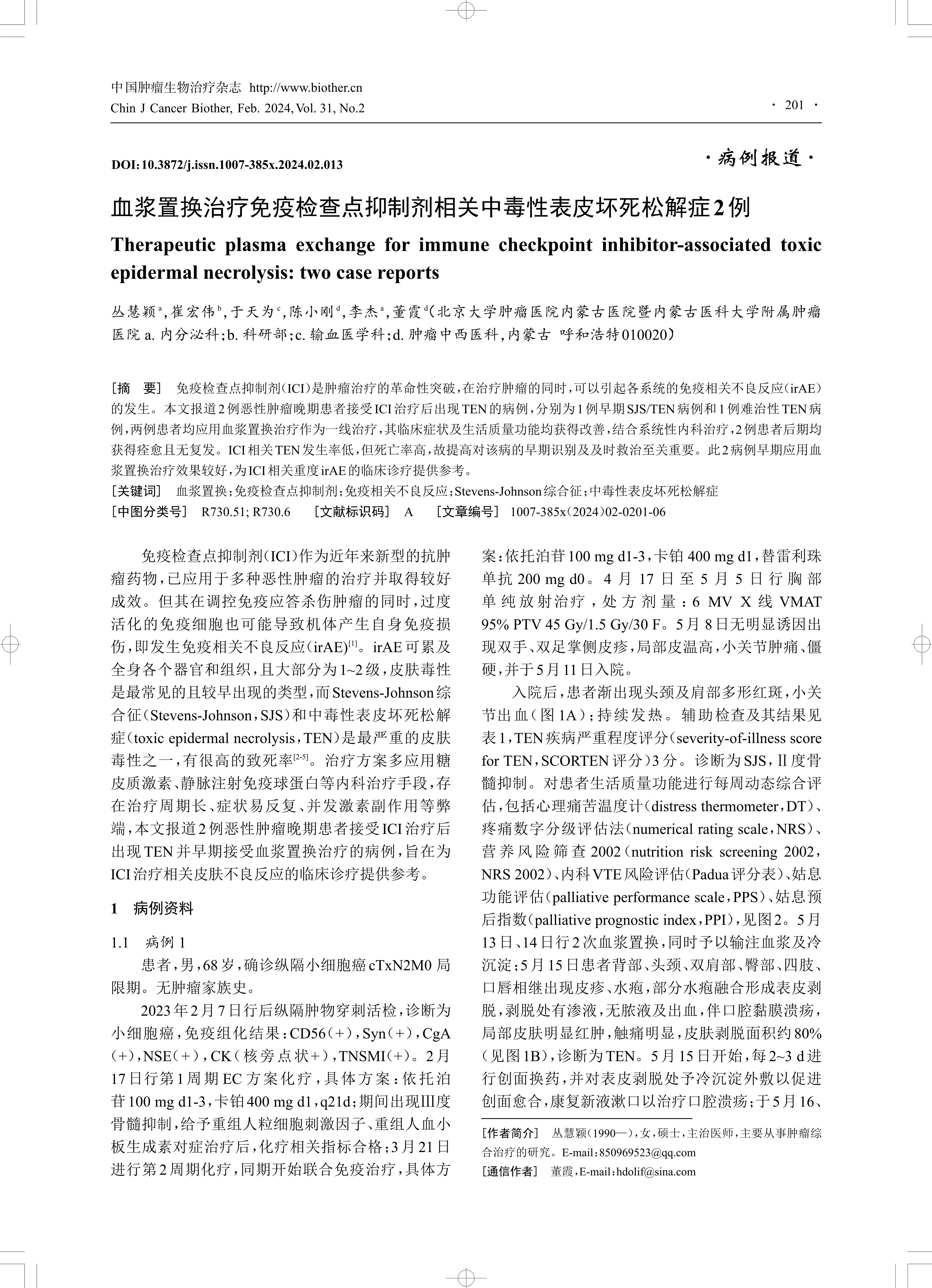 免疫检查点抑制剂(ICI)是肿瘤治疗的革命性突破,在治疗肿瘤的同时,可以引起各系统的免疫相关不良反应(irAE)的发生。本文报道2例恶性肿瘤晚期患者接受ICI 治疗后出现TEN 的病例,分别为1例早期SJS/TEN 病例和1例难治性TEN 病例,两例患者均应用血浆置换治疗作为一线治疗,其临床症状及生活质量功能均获得改善,结合系统性内科治疗,2例患者后期均获得痊愈且无复发。ICI 相关TEN发生率低,但死亡率高,故提高对该病的早期识别及及时救治至关重要。此2病例早期应用血浆置换治疗效果较好,为ICI相关重度irAE的临床诊疗提供参考。