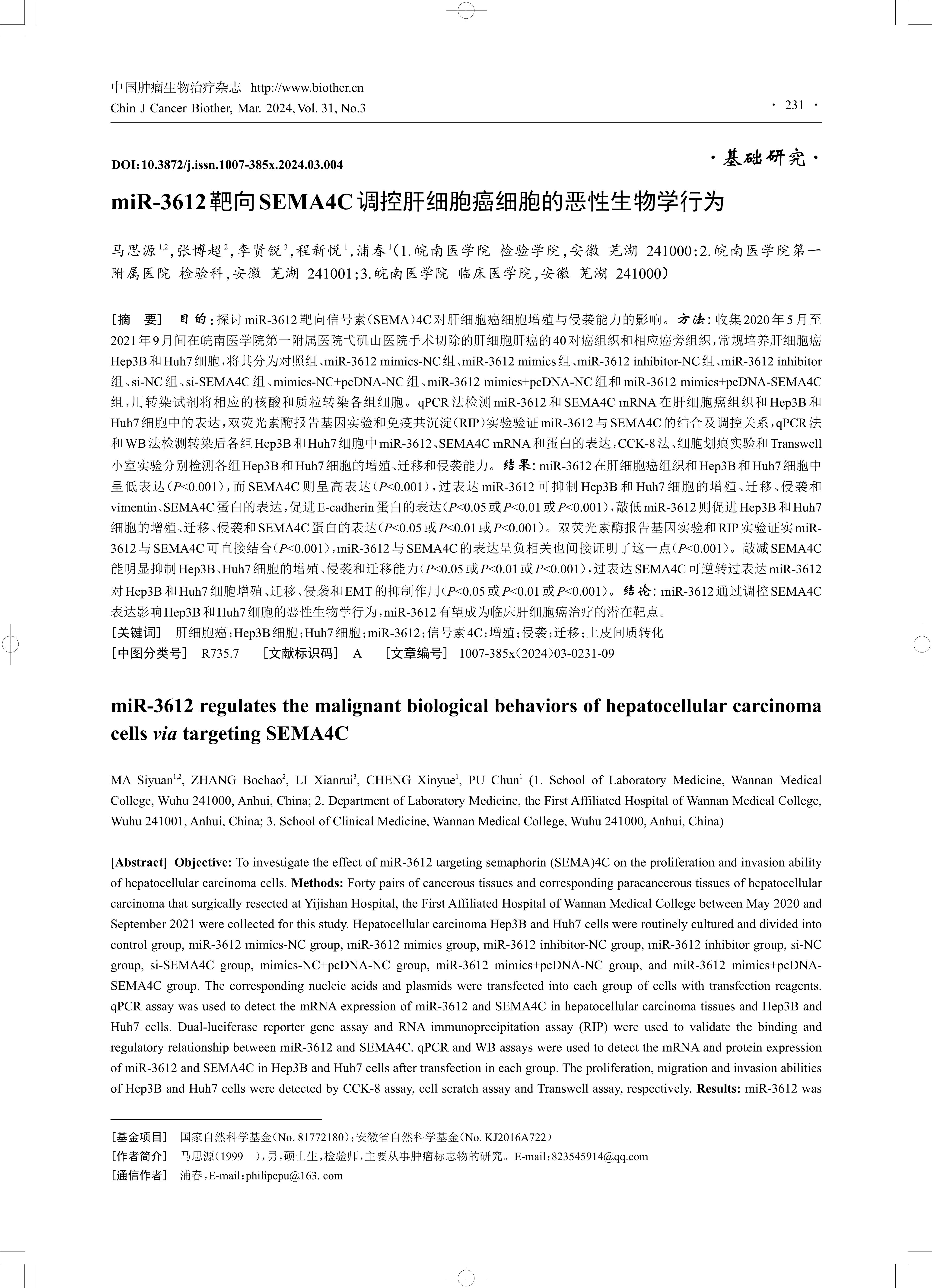 Objective: To investigate the effect of miR-3612 targeting semaphorin (SEMA)4C on the proliferation and invasion ability of hepatocellular carcinoma cells. Methods: Forty pairs of cancerous tissues and corresponding paracancerous tissues of hepatocellular carcinoma that surgically resected at Yijishan Hospital, the First Affiliated Hospital of Wannan Medical College between May 2020 and September 2021 were collected for this study. Hepatocellular carcinoma Hep3B and Huh7 cells were routinely cultured and divided into control group, miR-3612 mimics-NC group, miR-3612 mimics group, miR-3612 inhibitor-NC group, miR-3612 inhibitor group, si-NC group, si-SEMA4C group, mimics-NC+pcDNA-NC group, miR-3612 mimics+pcDNA-NC group, and miR-3612 mimics+pcDNA- SEMA4C group. The corresponding nucleic acids and plasmids were transfected into each group of cells with transfection reagents.qPCR assay was used to detect the mRNA expression of miR-3612 and SEMA4C in hepatocellular carcinoma tissues and Hep3B and Huh7 cells. Dual-luciferase reporter gene assay and RNA immunoprecipitation assay (RIP) were used to validate the binding and regulatory relationship between miR-3612 and SEMA4C. qPCR and WB assays were used to detect the mRNA and protein expression of miR-3612 and SEMA4C in Hep3B and Huh7 cells after transfection in each group. The proliferation, migration and invasion abilities of Hep3B and Huh7 cells were detected by CCK-8 assay, cell scratch assay and Transwell assay, respectively. Results: miR-3612 was lowly expressed in hepatocellular carcinoma tissues and Hep3B and Huh7 cells (P<0.001), whereas SEMA4C was highly expressed (P<0.001). Overexpression of miR-3612 suppressed proliferation, migration, invasion, and expression of vimentin and SEMA4C proteins in Hep3B and Huh7 cells, promoted E-cadherin protein expression (P<0.05 or P<0.01 or P<0.001), and knockdown of miR-3612 promoted proliferation, migration, invasion and SEMA4C protein expression in Hep3B and Huh7 cells (P<0.05 or P<0.01 or P<0.001). Dual luciferase reporter gene assay and RIP assay confirmed that miR-3612 bound directly to SEMA4C (P<0.001), as indirectly evidenced by the negative correlation between miR-3612 and SEMA4C expression (P<0.001). Knockdown of SEMA4C significantly inhibited the proliferation, invasion and migration of Hep3B and Huh7 cells (P<0.05 or P<0.01 or P<0.001), and overexpression of SEMA4C reversed the inhibitory effect of miR-3612 overexpression on proliferation, migration, invasion and epithelial-mesenchymal transition (EMT) of Hep3B and Huh7 cells (P<0.05 or P<0.01 or P< 0.001). Conclusion: miR-3612 affects the malignant biological behaviors of Hep3B and Huh7 cells by regulating SEMA4C expression, and it is expected to be a potential target for clinical hepatocellular carcinoma therapy.