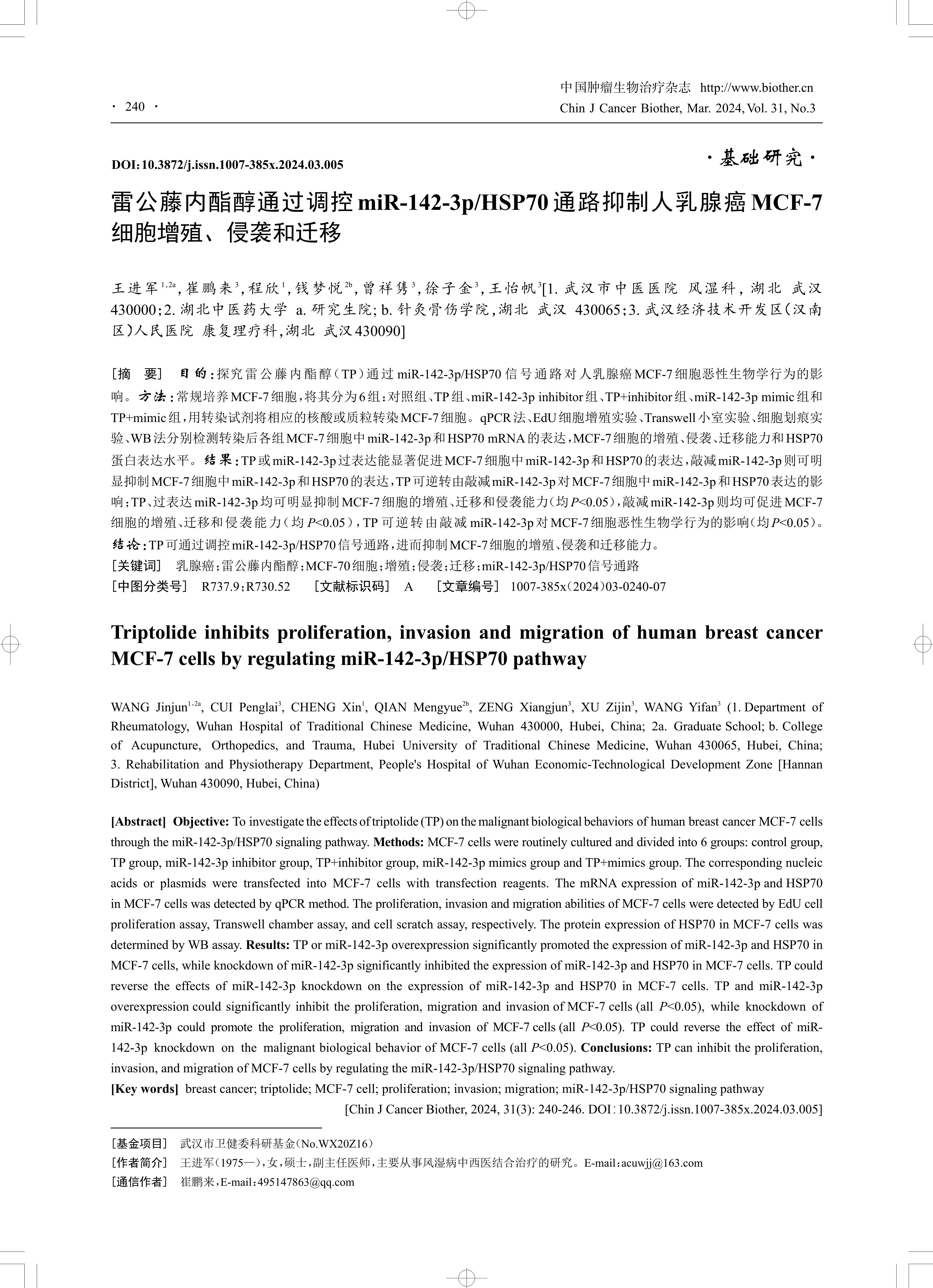 Objective: To investigate the effects of triptolide (TP) on the malignant biological behaviors of human breast cancer MCF-7 cells through the miR-142-3p/HSP70 signaling pathway. Methods: MCF-7 cells were routinely cultured and divided into 6 groups: control group, TP group, miR-142-3p inhibitor group, TP+inhibitor group, miR-142-3p mimics group and TP+mimics group. The corresponding nucleic acids or plasmids were transfected into MCF-7 cells with transfection reagents. The mRNA expression of miR-142-3p and HSP70 in MCF-7 cells was detected by qPCR method. The proliferation, invasion and migration abilities of MCF-7 cells were detected by EdU cell proliferation assay, Transwell chamber assay, and cell scratch assay, respectively. The protein expression of HSP70 in MCF-7 cells was determined by WB assay. Results: TP or miR-142-3p overexpression significantly promoted the expression of miR-142-3p and HSP70 in MCF-7 cells, while knockdown of miR-142-3p significantly inhibited the expression of miR-142-3p and HSP70 in MCF-7 cells. TP could reverse the effects of miR-142-3p knockdown on the expression of miR-142-3p and HSP70 in MCF-7 cells. TP and miR-142-3p overexpression could significantly inhibit the proliferation, migration and invasion of MCF-7 cells (all P<0.05), while knockdown of miR-142-3p could promote the proliferation, migration and invasion of MCF-7 cells (all P<0.05). TP could reverse the effect of miR-142-3p knockdown on the malignant biological behavior of MCF-7 cells (all P<0.05). Conclusions: TP can inhibit the proliferation, invasion, and migration of MCF-7 cells by regulating the miR-142-3p/HSP70 signaling pathway.