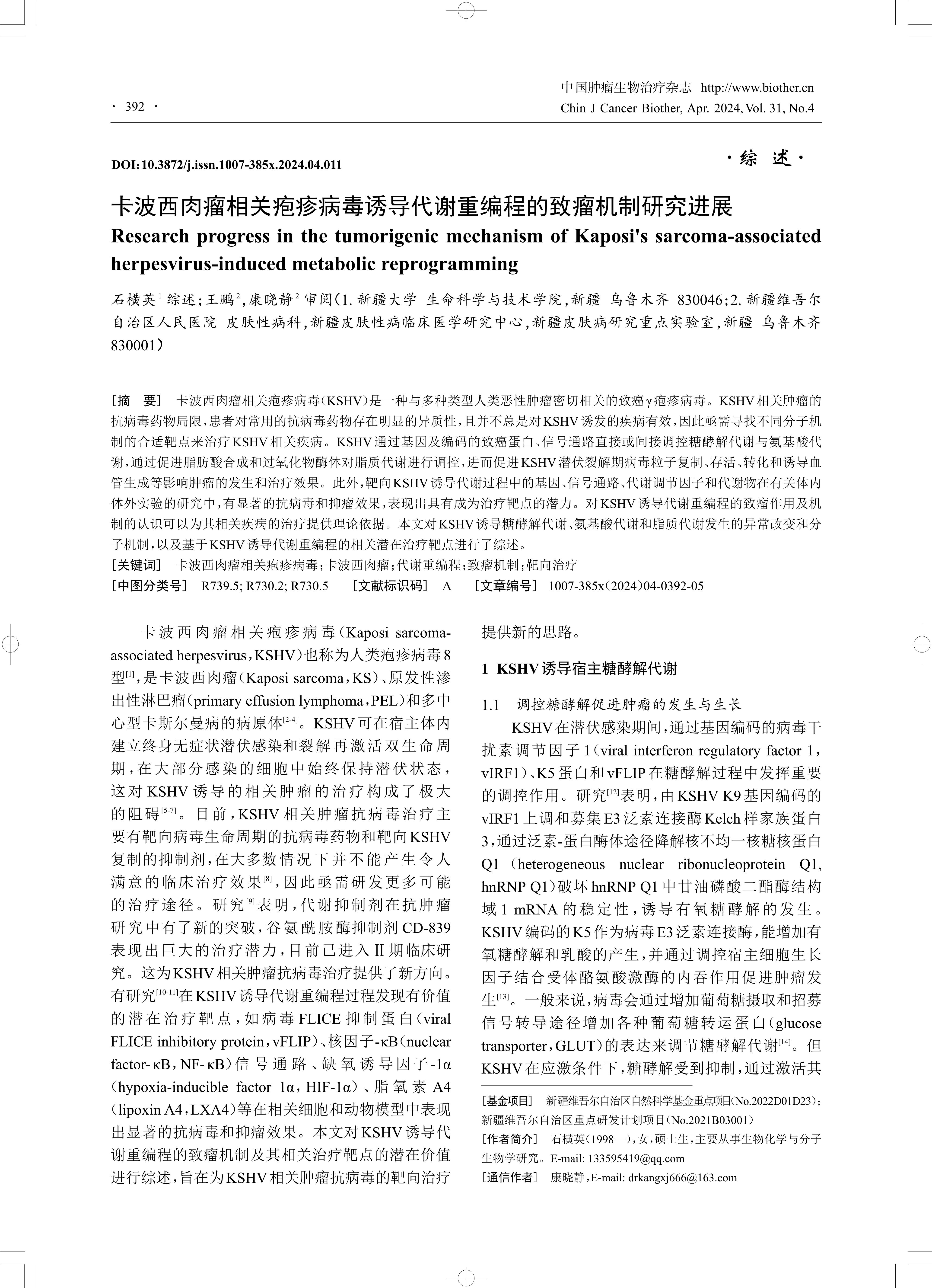 卡波西肉瘤相关疱疹病毒(KSHV)是一种与多种类型人类恶性肿瘤密切相关的致癌γ疱疹病毒。KSHV相关肿瘤的抗病毒药物局限,患者对常用的抗病毒药物存在明显的异质性,且并不总是对KSHV诱发的疾病有效,因此亟需寻找不同分子机制的合适靶点来治疗KSHV 相关疾病。KSHV 通过基因及编码的致癌蛋白、信号通路直接或间接调控糖酵解代谢与氨基酸代谢,通过促进脂肪酸合成和过氧化物酶体对脂质代谢进行调控,进而促进KSHV潜伏裂解期病毒粒子复制、存活、转化和诱导血管生成等影响肿瘤的发生和治疗效果。此外,靶向KSHV诱导代谢过程中的基因、信号通路、代谢调节因子和代谢物在有关体内体外实验的研究中,有显著的抗病毒和抑瘤效果,表现出具有成为治疗靶点的潜力。对KSHV诱导代谢重编程的致瘤作用及机制的认识可以为其相关疾病的治疗提供理论依据。本文对KSHV诱导糖酵解代谢、氨基酸代谢和脂质代谢发生的异常改变和分子机制,以及基于KSHV诱导代谢重编程的相关潜在治疗靶点进行了综述。