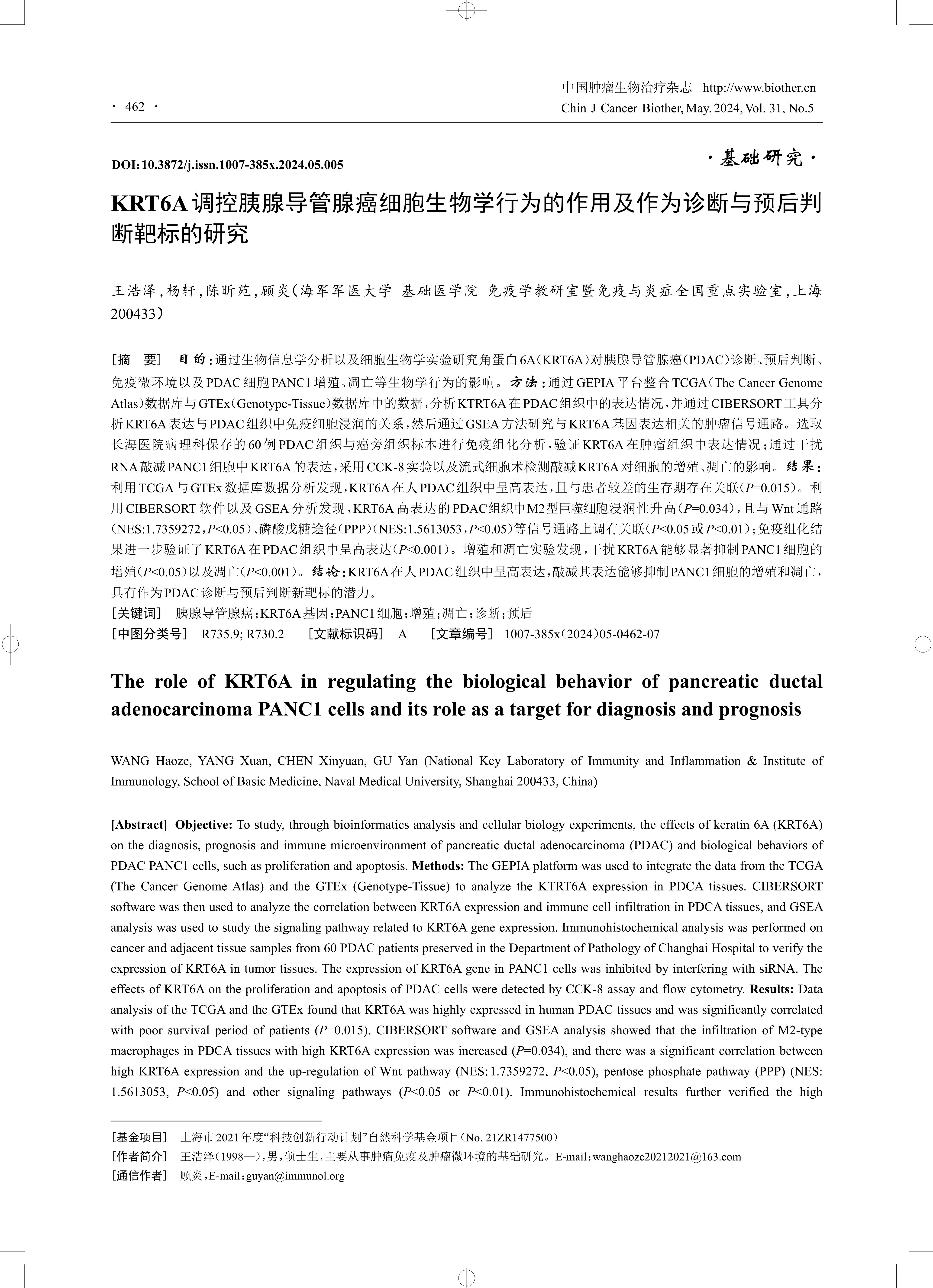 Objective: To study, through bioinformatics analysis and cellular biology experiments, the effects of keratin 6A (KRT6A)on the diagnosis, prognosis and immune microenvironment of pancreatic ductal adenocarcinoma (PDAC) and biological behaviors of PDAC PANC1 cells, such as proliferation and apoptosis. Methods: The GEPIA platform was used to integrate the data from the TCGA (The Cancer Genome Atlas) and the GTEx (Genotype-Tissue) to analyze the KTRT6A expression in PDCA tissues. CIBERSORT software was then used to analyze the correlation between KRT6A expression and immune cell infiltration in PDCA tissues, and GSEA analysis was used to study the signaling pathway related to KRT6A gene expression. Immunohistochemical analysis was performed on cancer and adjacent tissue samples from 60 PDAC patients preserved in the Department of Pathology of Changhai Hospital to verify the expression of KRT6A in tumor tissues. The expression of KRT6A gene in PANC1 cells was inhibited by interfering with siRNA. The effects of KRT6A on the proliferation and apoptosis of PDAC cells were detected by CCK-8 assay and flow cytometry. Results: Data analysis of the TCGA and the GTEx found that KRT6A was highly expressed in human PDAC tissues and was significantly correlated with poor survival period of patients (P=0.015). CIBERSORT software and GSEA analysis showed that the infiltration of M2-type macrophages in PDCA tissues with high KRT6A expression was increased (P=0.034), and there was a significant correlation between high KRT6A expression and the up-regulation of Wnt pathway (NES: 1.7359272, P<0.05), pentose phosphate pathway (PPP) (NES:1.5613053, P<0.05) and other signaling pathways (P<0.05 or P<0.01). Immunohistochemical results further verified the high expression of KRT6A in PDCA tissues (P<0.001). Proliferation and apoptosis experiments showed that interfering with KRT6A gene could significantly inhibit the proliferation (P<0.05) and apoptosis (P<0.001) of PANC1 cells. Conclusion: KRT6A is highly expressed in human PDAC tissues, and knocking down its expression can inhibit the proliferation and apoptosis of PANC1 cells, and has the potential to be a new target for PDAC diagnosis and prognosis.