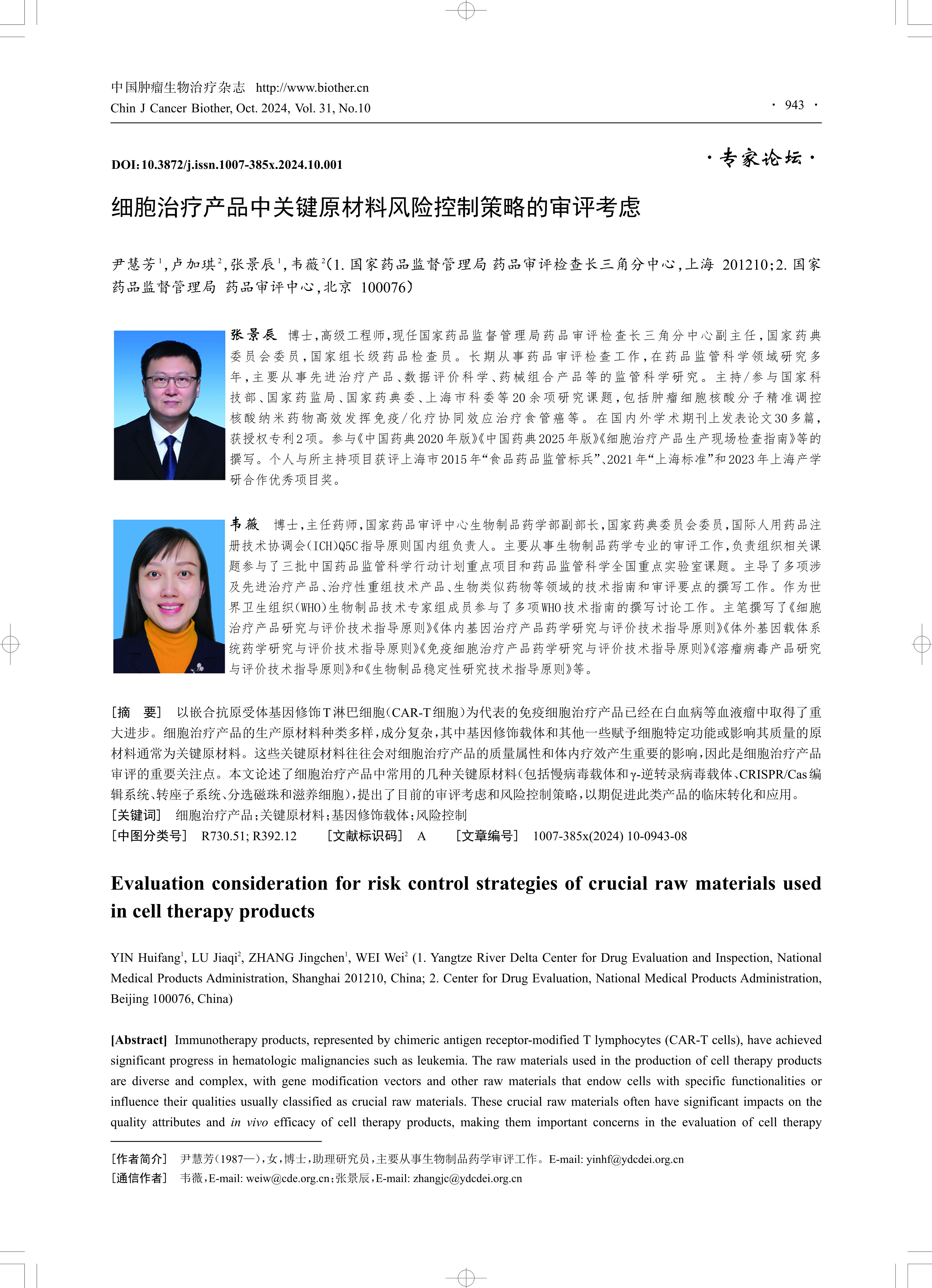 以嵌合抗原受体基因修饰T淋巴细胞(CAR-T细胞)为代表的免疫细胞治疗产品已经在白血病等血液瘤中取得了重 大进步。细胞治疗产品的生产原材料种类多样,成分复杂,其中基因修饰载体和其他一些赋予细胞特定功能或影响其质量的原 材料通常为关键原材料。这些关键原材料往往会对细胞治疗产品的质量属性和体内疗效产生重要的影响,因此是细胞治疗产品 审评的重要关注点。本文论述了细胞治疗产品中常用的几种关键原材料(包括慢病毒载体和γ-逆转录病毒载体、CRISPR/Cas编 辑系统、转座子系统、分选磁珠和滋养细胞),提出了目前的审评考虑和风险控制策略,以期促进此类产品的临床转化和应用。