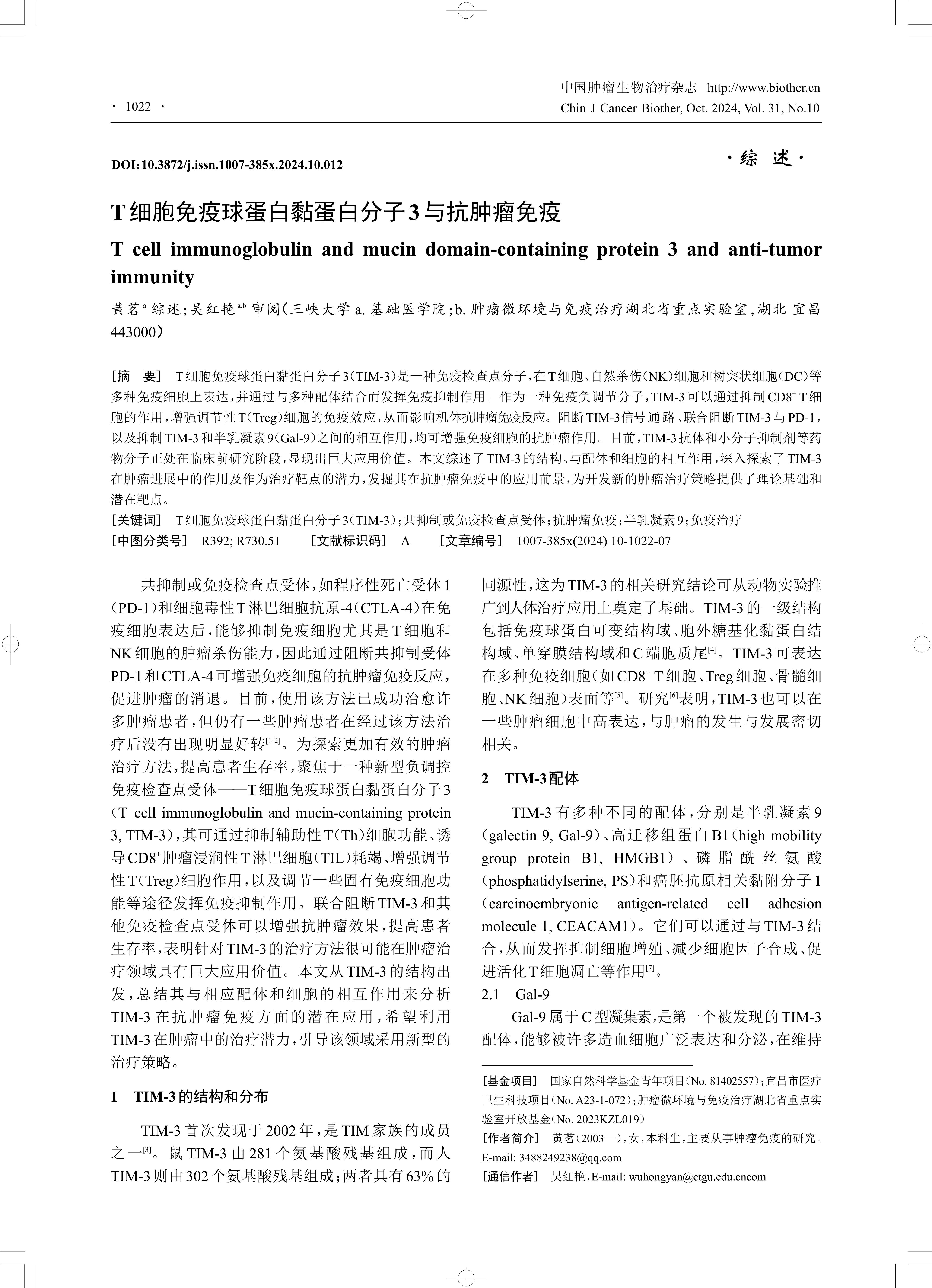T细胞免疫球蛋白黏蛋白分子3(TIM-3)是一种免疫检查点分子,在T细胞、自然杀伤(NK)细胞和树突状细胞(DC)等 多种免疫细胞上表达,并通过与多种配体结合而发挥免疫抑制作用。作为一种免疫负调节分子,TIM-3可以通过抑制CD8+ T细 胞的作用,增强调节性T(Treg)细胞的免疫效应,从而影响机体抗肿瘤免疫反应。阻断TIM-3信号通路、联合阻断TIM-3与PD-1, 以及抑制TIM-3和半乳凝素9(Gal-9)之间的相互作用,均可增强免疫细胞的抗肿瘤作用。目前,TIM-3抗体和小分子抑制剂等药 物分子正处在临床前研究阶段,显现出巨大应用价值。本文综述了TIM-3的结构、与配体和细胞的相互作用,深入探索了TIM-3 在肿瘤进展中的作用及作为治疗靶点的潜力,发掘其在抗肿瘤免疫中的应用前景,为开发新的肿瘤治疗策略提供了理论基础和 潜在靶点。