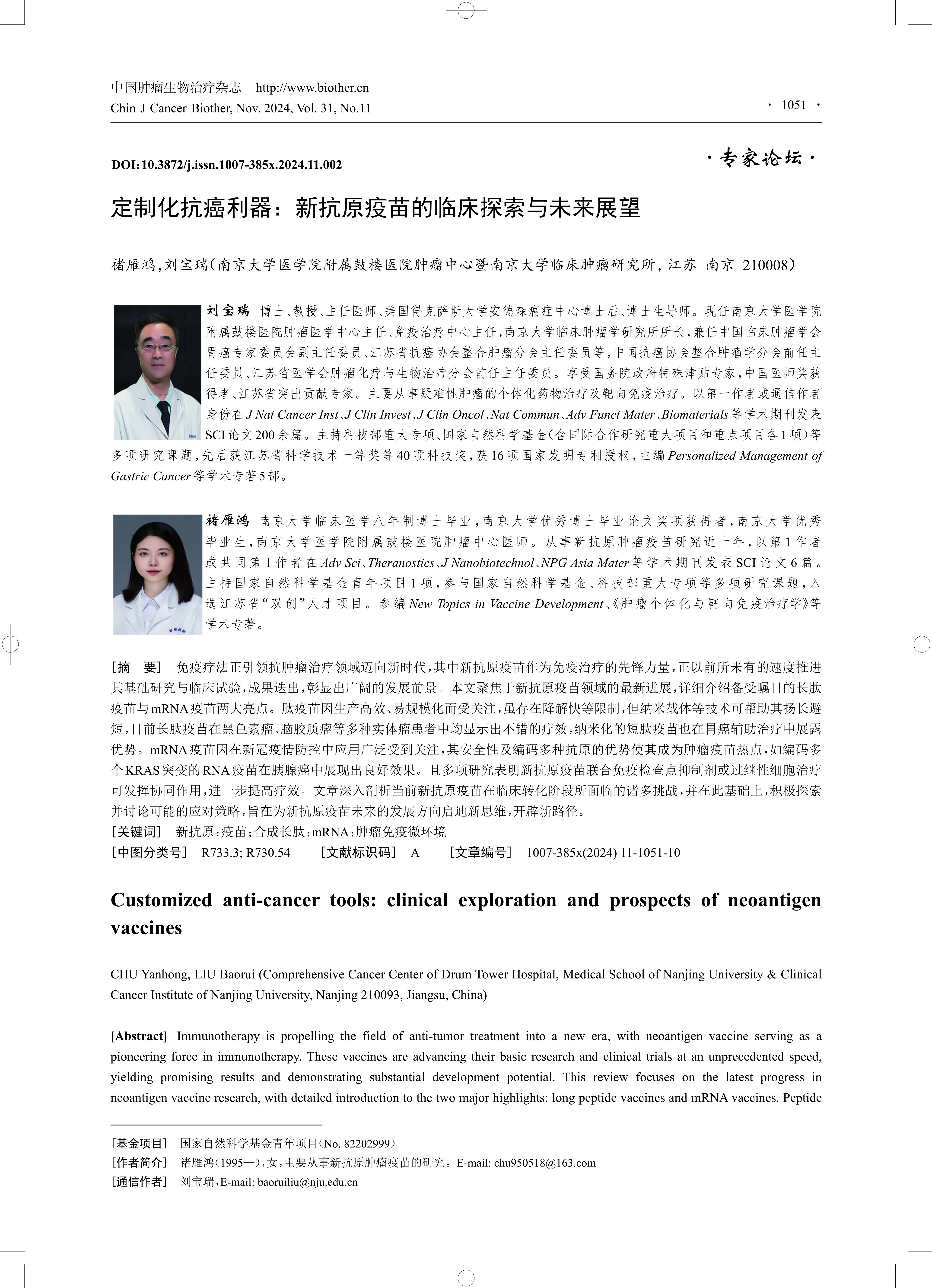 免疫疗法正引领抗肿瘤治疗领域迈向新时代,其中新抗原疫苗作为免疫治疗的先锋力量,正以前所未有的速度推进 其基础研究与临床试验,成果迭出,彰显出广阔的发展前景。本文聚焦于新抗原疫苗领域的最新进展,详细介绍备受瞩目的长肽 疫苗与mRNA疫苗两大亮点。肽疫苗因生产高效、易规模化而受关注,虽存在降解快等限制,但纳米载体等技术可帮助其扬长避 短,目前长肽疫苗在黑色素瘤、脑胶质瘤等多种实体瘤患者中均显示出不错的疗效,纳米化的短肽疫苗也在胃癌辅助治疗中展露 优势。mRNA疫苗因在新冠疫情防控中应用广泛受到关注,其安全性及编码多种抗原的优势使其成为肿瘤疫苗热点,如编码多 个KRAS突变的RNA疫苗在胰腺癌中展现出良好效果。且多项研究表明新抗原疫苗联合免疫检查点抑制剂或过继性细胞治疗 可发挥协同作用,进一步提高疗效。文章深入剖析当前新抗原疫苗在临床转化阶段所面临的诸多挑战,并在此基础上,积极探索 并讨论可能的应对策略,旨在为新抗原疫苗未来的发展方向启迪新思维,开辟新路径。