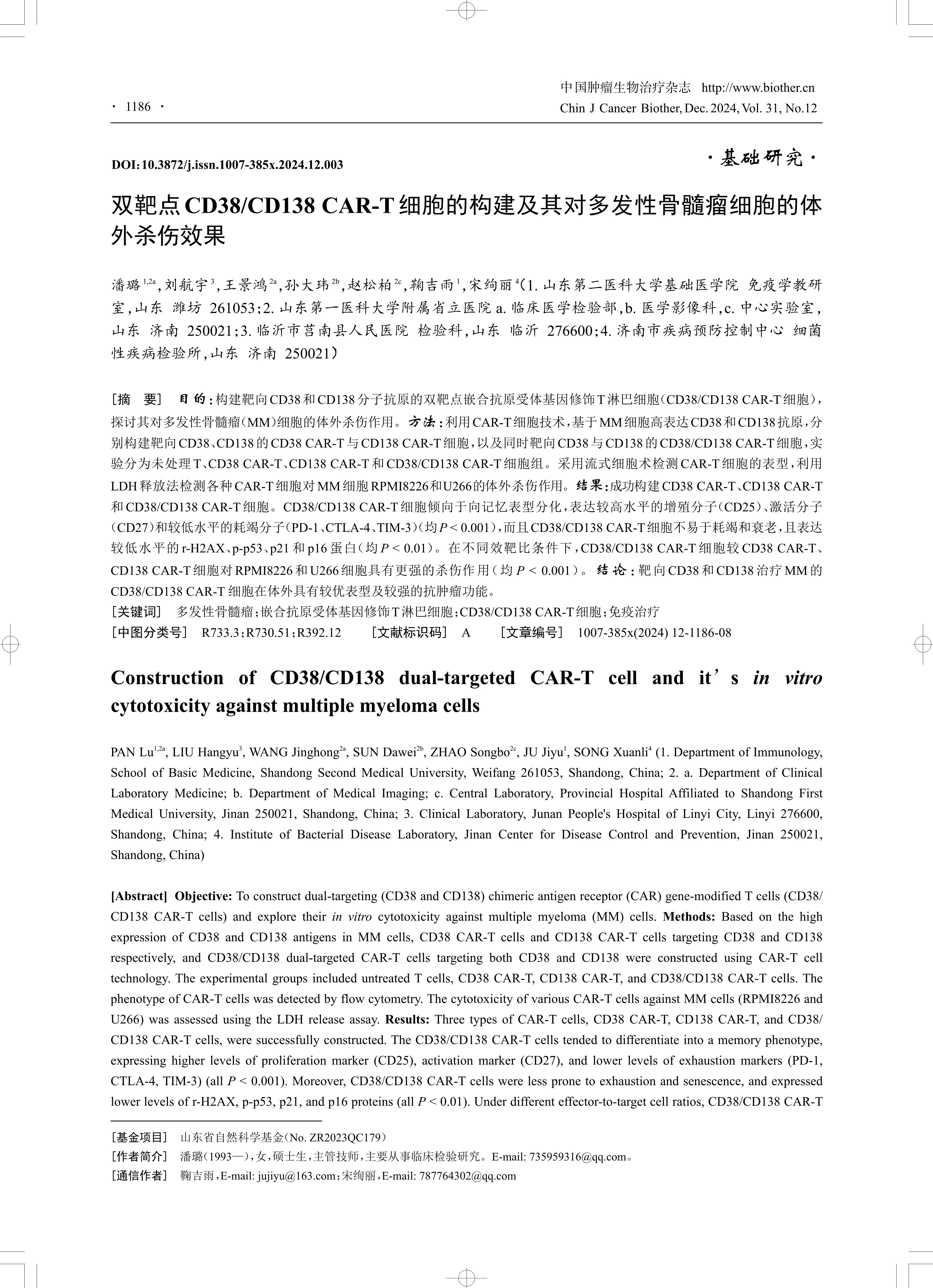 [摘 要] 目的:构建靶向CD38和CD138分子抗原的双靶点嵌合抗原受体基因修饰T淋巴细胞(CD38/CD138 CAR-T细胞), 探讨其对多发性骨髓瘤(MM)细胞的体外杀伤作用。方法:利用CAR-T细胞技术,基于MM细胞高表达CD38和CD138抗原,分 别构建靶向CD38、CD138的CD38 CAR-T与CD138 CAR-T细胞,以及同时靶向CD38与CD138的CD38/CD138 CAR-T细胞,实 验分为未处理T、CD38 CAR-T、CD138 CAR-T和CD38/CD138 CAR-T细胞组。采用流式细胞术检测CAR-T细胞的表型,利用 LDH释放法检测各种CAR-T细胞对MM细胞RPMI8226和U266的体外杀伤作用。结果:成功构建CD38 CAR-T、CD138 CAR-T 和CD38/CD138 CAR-T细胞。CD38/CD138 CAR-T细胞倾向于向记忆表型分化,表达较高水平的增殖分子(CD25)、激活分子 (CD27)和较低水平的耗竭分子(PD-1、CTLA-4、TIM-3)(均P < 0.001),而且CD38/CD138 CAR-T细胞不易于耗竭和衰老,且表达 较低水平的 r-H2AX、p-p53、p21 和 p16 蛋白(均 P < 0.01)。在不同效靶比条件下,CD38/CD138 CAR-T 细胞较 CD38 CAR-T、 CD138 CAR-T细胞对RPMI8226和U266细胞具有更强的杀伤作用(均 P < 0.001)。结论:靶向CD38和CD138治疗MM的 CD38/CD138 CAR-T 细胞在体外具有较优表型及较强的抗肿瘤功能。