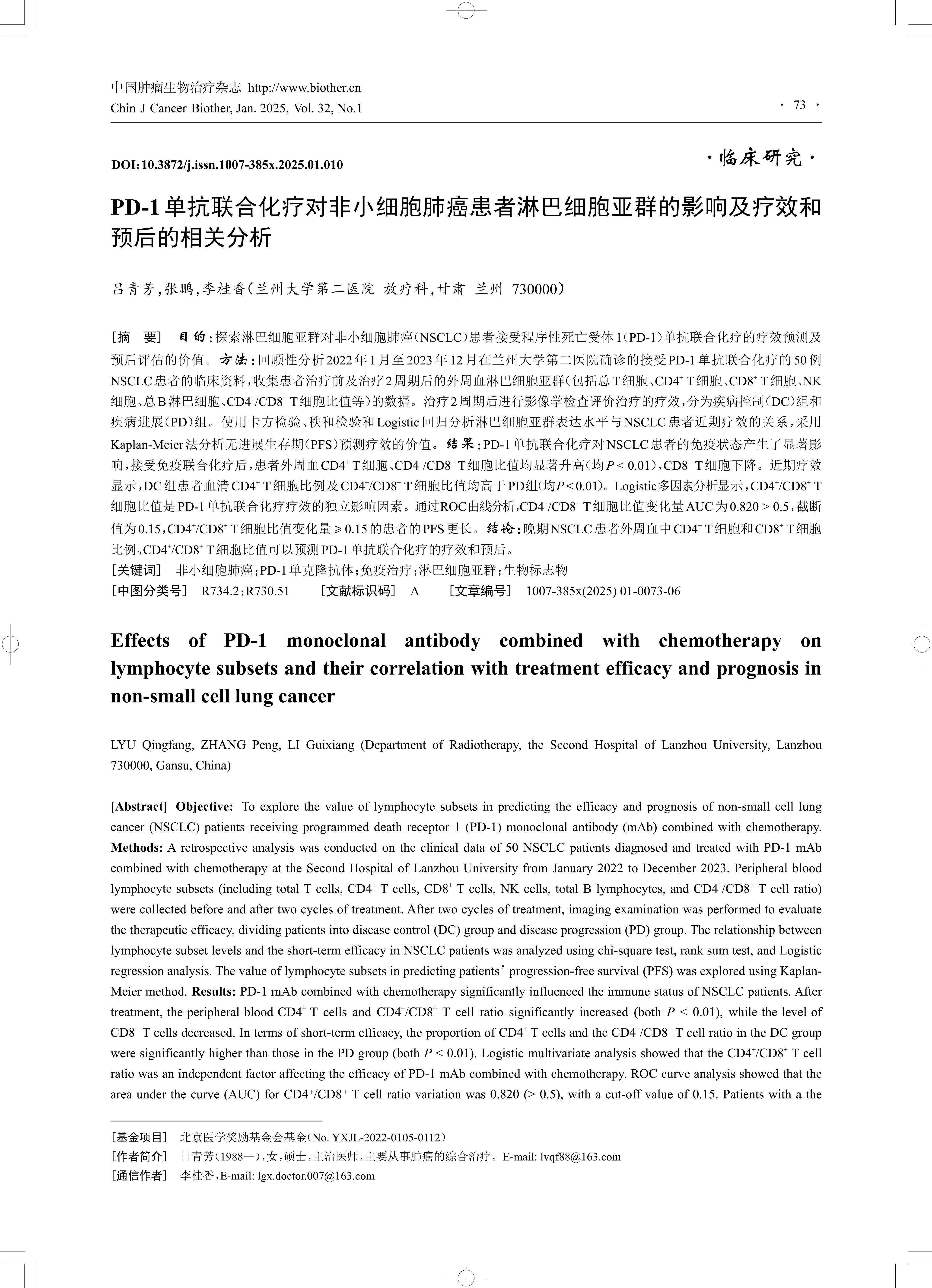 [Abstract] Objective: To explore the value of lymphocyte subsets in predicting the efficacy and prognosis of non-small cell lung cancer (NSCLC) patients receiving programmed death receptor 1 (PD-1) monoclonal antibody (mAb) combined with chemotherapy. Methods: A retrospective analysis was conducted on the clinical data of 50 NSCLC patients diagnosed and treated with PD-1 mAb combined with chemotherapy at the Second Hospital of Lanzhou University from January 2022 to December 2023. Peripheral blood lymphocyte subsets (including total T cells, CD4+ T cells, CD8+ T cells, NK cells, total B lymphocytes, and CD4+ /CD8+ T cell ratio) were collected before and after two cycles of treatment. After two cycles of treatment, imaging examination was performed to evaluate the therapeutic efficacy, dividing patients into disease control (DC) group and disease progression (PD) group. The relationship between lymphocyte subset levels and the short-term efficacy in NSCLC patients was analyzed using chi-square test, rank sum test, and Logistic regression analysis. The value of lymphocyte subsets in predicting patients’ progression-free survival (PFS) was explored using KaplanMeier method. Results: PD-1 mAb combined with chemotherapy significantly influenced the immune status of NSCLC patients. After treatment, the peripheral blood CD4+ T cells and CD4+ /CD8+ T cell ratio significantly increased (both P < 0.01), while the level of CD8+ T cells decreased. In terms of short-term efficacy, the proportion of CD4+ T cells and the CD4+ /CD8+ T cell ratio in the DC group were significantly higher than those in the PD group (both P < 0.01). Logistic multivariate analysis showed that the CD4+ /CD8+ T cell ratio was an independent factor affecting the efficacy of PD-1 mAb combined with chemotherapy. ROC curve analysis showed that the area under the curve (AUC) for CD4?/CD8? T cell ratio variation was 0.820 (> 0.5), with a cut-off value of 0.15. Patients with a the CD4+/CD8+ T cell ratio increase of ≥ 0.15 had a longer PFS. Conclusion: The proportion of CD4+ T cells, CD8+ T cells, and the CD4+/CD8+ T cell ratio in peripheral blood can predict the efficacy and prognosis of PD-1 mAb combined with chemotherapy in advanced NSCLC patients.