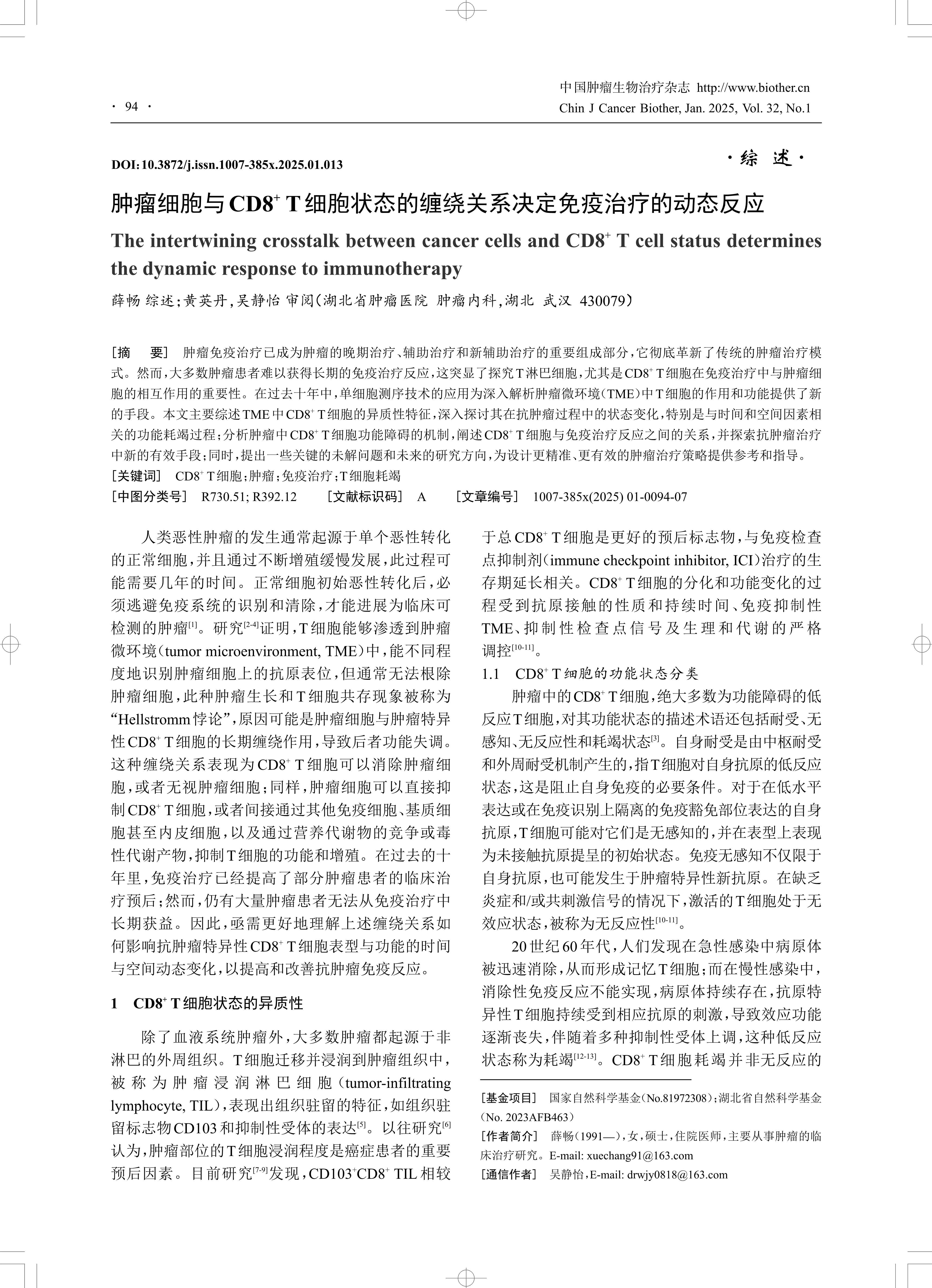 [摘 要] 肿瘤免疫治疗已成为肿瘤的晚期治疗、辅助治疗和新辅助治疗的重要组成部分,它彻底革新了传统的肿瘤治疗模 式。然而,大多数肿瘤患者难以获得长期的免疫治疗反应,这突显了探究T淋巴细胞,尤其是CD8+ T细胞在免疫治疗中与肿瘤细 胞的相互作用的重要性。在过去十年中,单细胞测序技术的应用为深入解析肿瘤微环境(TME)中T细胞的作用和功能提供了新 的手段。本文主要综述TME中CD8+ T细胞的异质性特征,深入探讨其在抗肿瘤过程中的状态变化,特别是与时间和空间因素相 关的功能耗竭过程;分析肿瘤中CD8+ T细胞功能障碍的机制,阐述CD8+ T细胞与免疫治疗反应之间的关系,并探索抗肿瘤治疗 中新的有效手段;同时,提出一些关键的未解问题和未来的研究方向,为设计更精准、更有效的肿瘤治疗策略提供参考和指导。