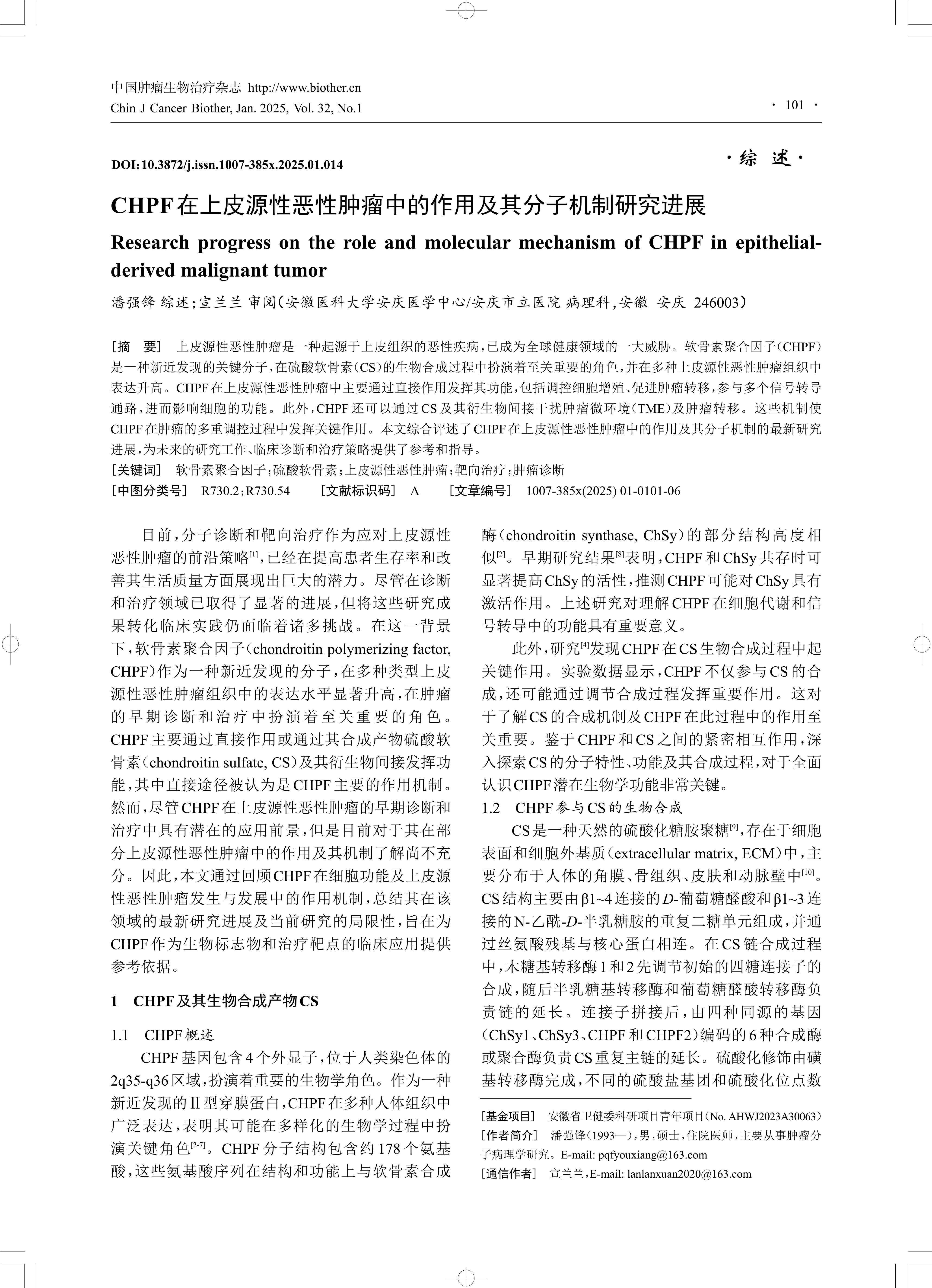 [摘 要] 上皮源性恶性肿瘤是一种起源于上皮组织的恶性疾病,已成为全球健康领域的一大威胁。软骨素聚合因子(CHPF) 是一种新近发现的关键分子,在硫酸软骨素(CS)的生物合成过程中扮演着至关重要的角色,并在多种上皮源性恶性肿瘤组织中 表达升高。CHPF在上皮源性恶性肿瘤中主要通过直接作用发挥其功能,包括调控细胞增殖、促进肿瘤转移,参与多个信号转导 通路,进而影响细胞的功能。此外,CHPF 还可以通过 CS 及其衍生物间接干扰肿瘤微环境(TME)及肿瘤转移。这些机制使 CHPF在肿瘤的多重调控过程中发挥关键作用。本文综合评述了CHPF在上皮源性恶性肿瘤中的作用及其分子机制的最新研究 进展,为未来的研究工作、临床诊断和治疗策略提供了参考和指导。