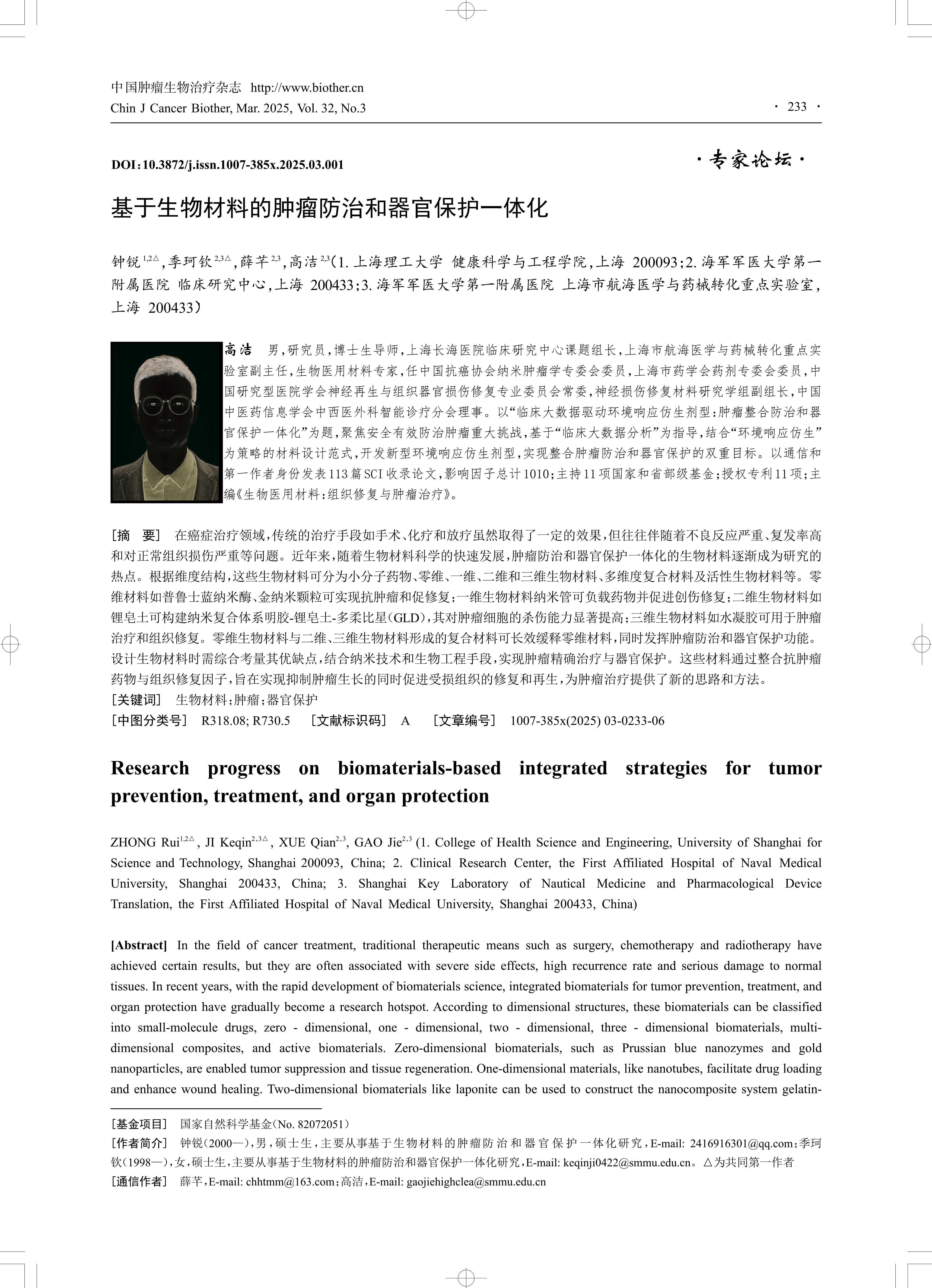 [Abstract] In the field of cancer treatment, traditional therapeutic means such as surgery, chemotherapy and radiotherapy have achieved certain results, but they are often associated with severe side effects, high recurrence rate and serious damage to normal tissues. In recent years, with the rapid development of biomaterials science, integrated biomaterials for tumor prevention, treatment, and organ protection have gradually become a research hotspot. According to dimensional structures, these biomaterials can be classified into small-molecule drugs, zero - dimensional, one - dimensional, two - dimensional, three - dimensional biomaterials, multi dimensional composites, and active biomaterials. Zero-dimensional biomaterials, such as Prussian blue nanozymes and gold nanoparticles, are enabled tumor suppression and tissue regeneration. One-dimensional materials, like nanotubes, facilitate drug loading and enhance wound healing. Two-dimensional biomaterials like laponite can be used to construct the nanocomposite system gelatin laponite-doxorubicin (GLD), which significantly enhances the killing ability against tumor cells. Three-dimensional biomaterials, such as hydrogels, are applicable for tumor therapy and tissue repair. Composites formed by zero - dimensional materials and two - or three - dimensional biomaterials can achieve long - term slow release of zero - dimensional biomaterials and simultaneously play the functions of tumor prevention and treatment and organ protection. When designing biomaterials, it is critical to holistically evaluate their strengths and limitations, leveraging nanotechnology and bioengineering strategies to achieve precise tumor targeting and organ preservation. By integrating anti-tumor drugs and tissue repair factors, these materials aim to achieve inhibition of tumor growth while promoting repair and regeneration of damaged tissues, providing new ideas and methods for tumor treatment.