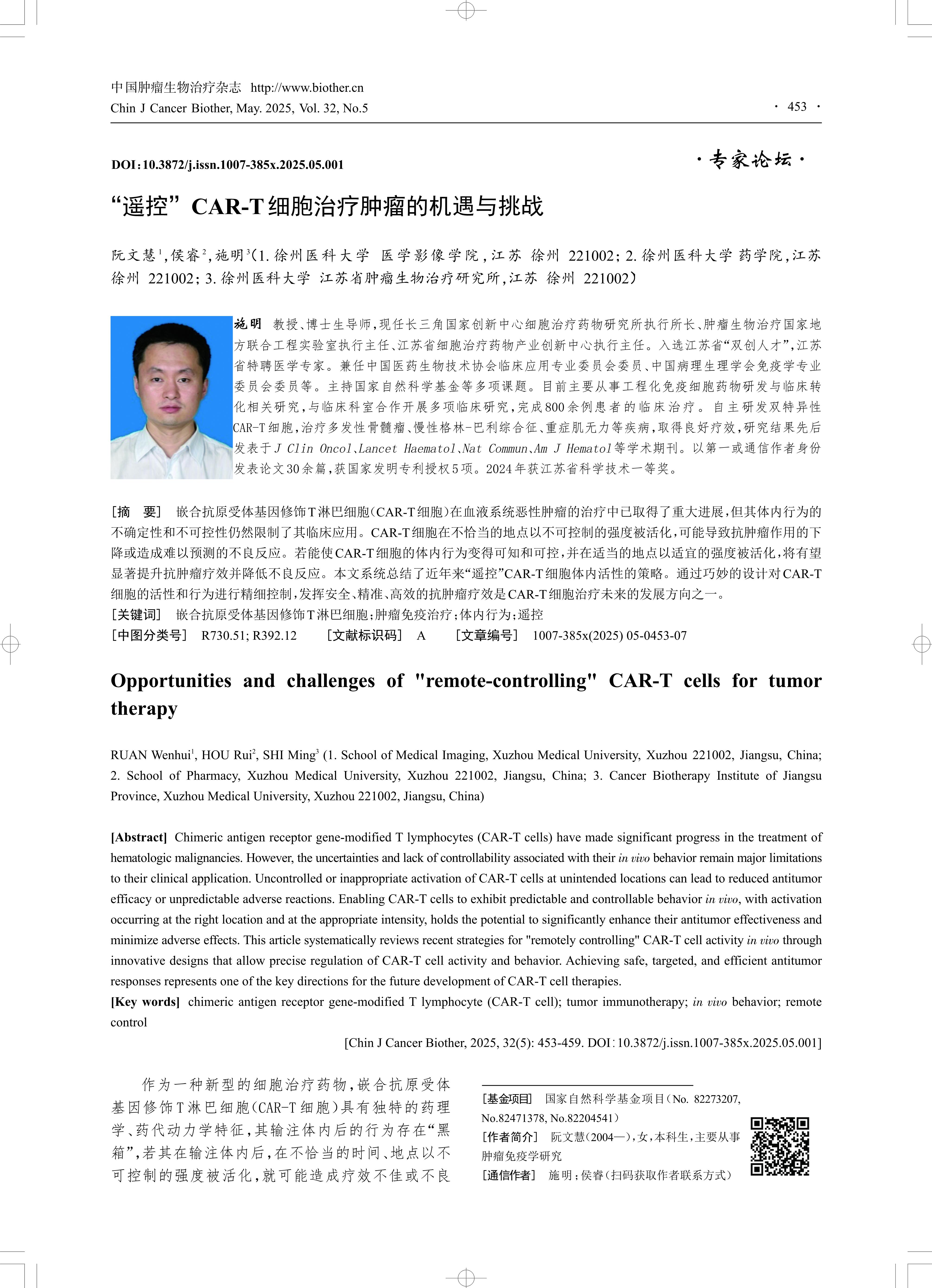 [摘 要] 嵌合抗原受体基因修饰T淋巴细胞(CAR-T细胞)在血液系统恶性肿瘤的治疗中已取得了重大进展,但其体内行为的 不确定性和不可控性仍然限制了其临床应用。CAR-T细胞在不恰当的地点以不可控制的强度被活化,可能导致抗肿瘤作用的下 降或造成难以预测的不良反应。若能使CAR-T细胞的体内行为变得可知和可控,并在适当的地点以适宜的强度被活化,将有望 显著提升抗肿瘤疗效并降低不良反应。本文系统总结了近年来“遥控”CAR-T细胞体内活性的策略。通过巧妙的设计对CAR-T 细胞的活性和行为进行精细控制,发挥安全、精准、高效的抗肿瘤疗效是CAR-T细胞治疗未来的发展方向之一。
