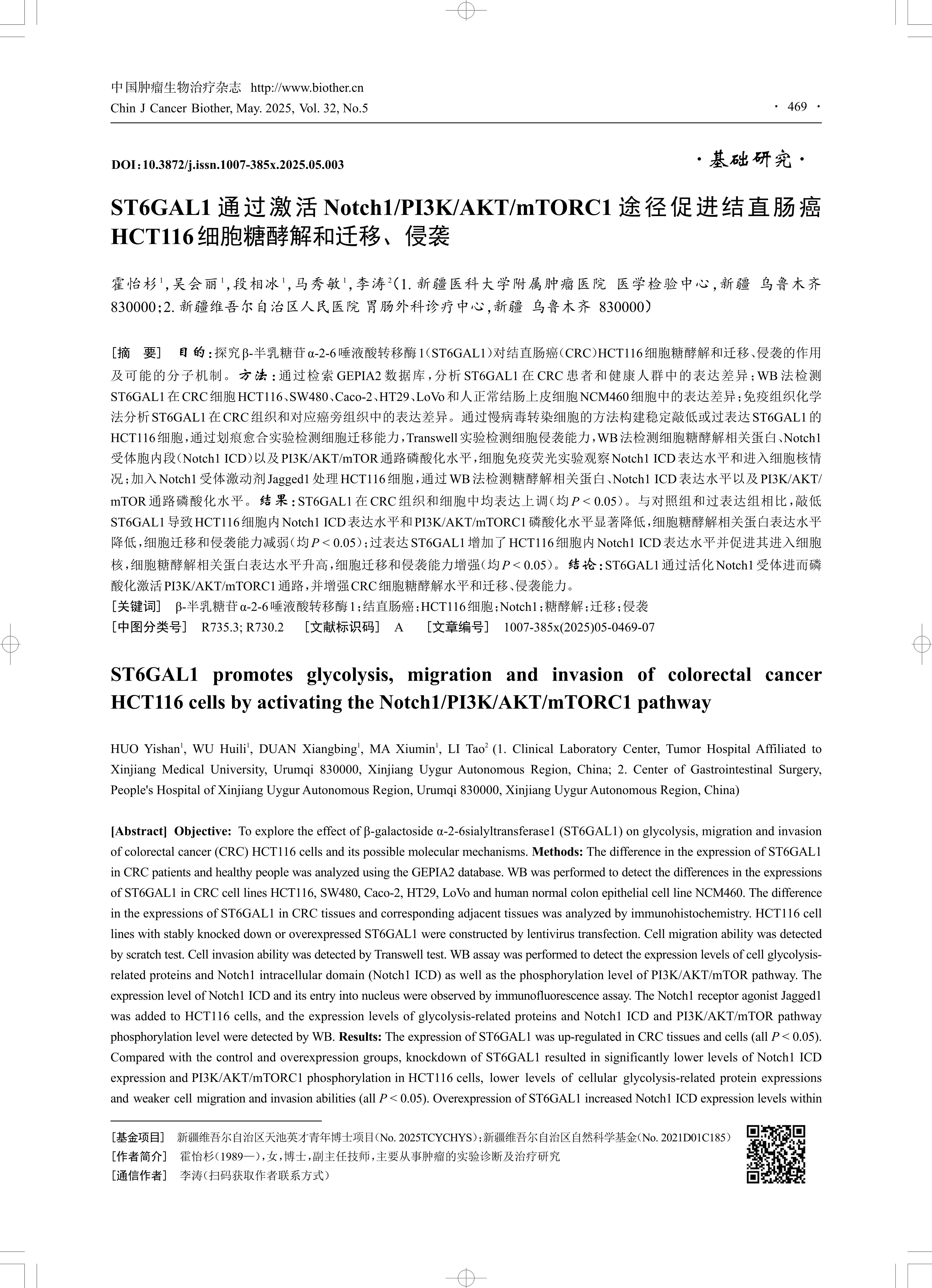[摘 要] 目的:探究β-半乳糖苷α-2-6唾液酸转移酶1(ST6GAL1)对结直肠癌(CRC)HCT116细胞糖酵解和迁移、侵袭的作用 及可能的分子机制。方法:通过检索GEPIA2数据库,分析ST6GAL1在CRC患者和健康人群中的表达差异;WB法检测 ST6GAL1在CRC细胞HCT116、SW480、Caco-2、HT29、LoVo和人正常结肠上皮细胞NCM460细胞中的表达差异;免疫组织化学 法分析ST6GAL1在CRC组织和对应癌旁组织中的表达差异。通过慢病毒转染细胞的方法构建稳定敲低或过表达ST6GAL1的 HCT116细胞,通过划痕愈合实验检测细胞迁移能力,Transwell实验检测细胞侵袭能力,WB法检测细胞糖酵解相关蛋白、Notch1 受体胞内段(Notch1 ICD)以及PI3K/AKT/mTOR通路磷酸化水平,细胞免疫荧光实验观察Notch1 ICD表达水平和进入细胞核情 况;加入Notch1受体激动剂Jagged1处理HCT116细胞,通过WB法检测糖酵解相关蛋白、Notch1 ICD表达水平以及PI3K/AKT/ mTOR通路磷酸化水平。结果:ST6GAL1在CRC组织和细胞中均表达上调(均P < 0.05)。与对照组和过表达组相比,敲低 ST6GAL1导致HCT116细胞内Notch1 ICD表达水平和PI3K/AKT/mTORC1磷酸化水平显著降低,细胞糖酵解相关蛋白表达水平 降低,细胞迁移和侵袭能力减弱(均P < 0.05);过表达ST6GAL1增加了HCT116细胞内Notch1 ICD表达水平并促进其进入细胞 核,细胞糖酵解相关蛋白表达水平升高,细胞迁移和侵袭能力增强(均P < 0.05)。结论:ST6GAL1通过活化Notch1受体进而磷 酸化激活PI3K/AKT/mTORC1通路,并增强CRC细胞糖酵解水平和迁移、侵袭能力。