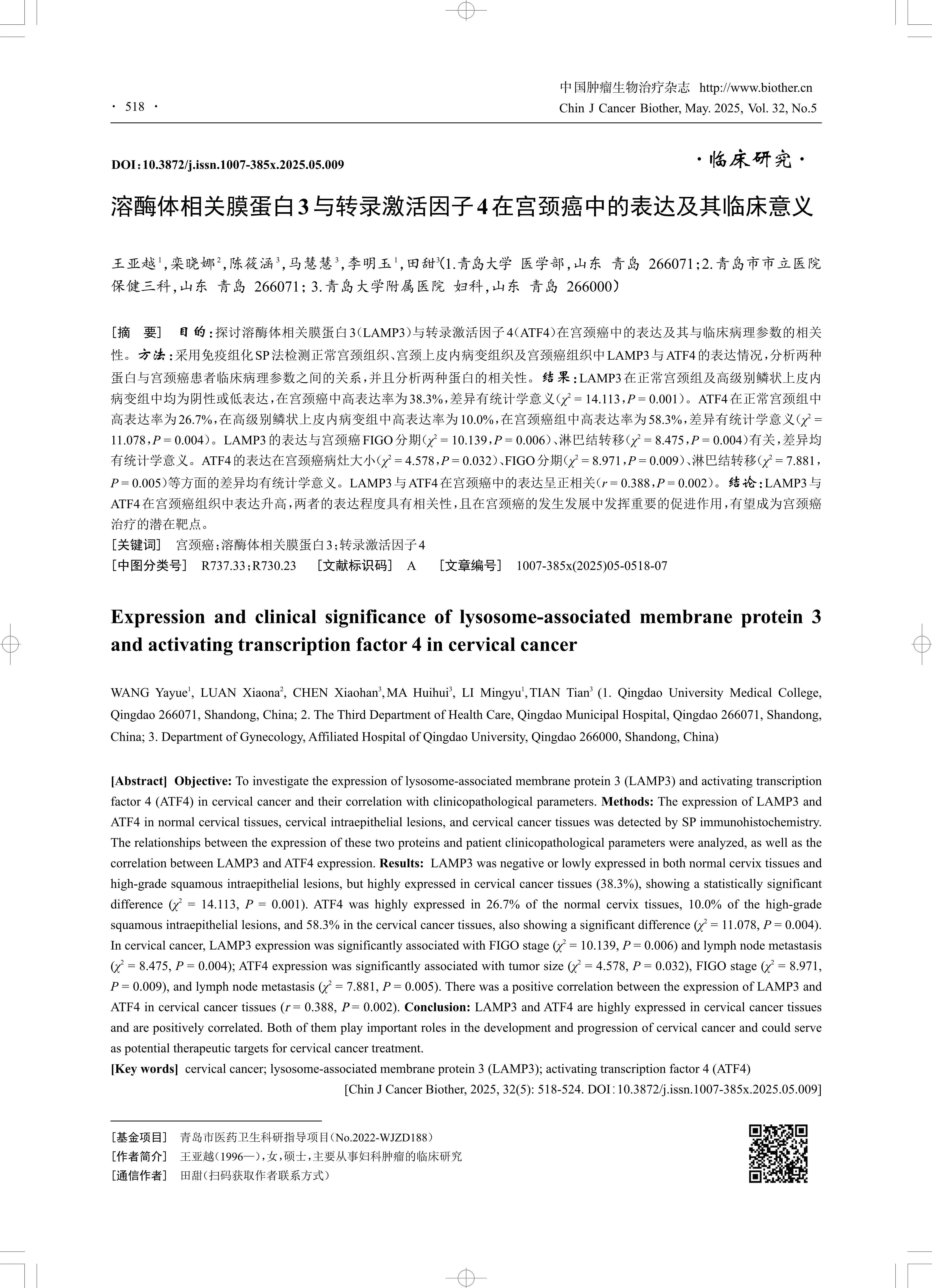 [摘 要] 目的:探讨溶酶体相关膜蛋白3(LAMP3)与转录激活因子4(ATF4)在宫颈癌中的表达及其与临床病理参数的相关 性。方法:采用免疫组化SP法检测正常宫颈组织、宫颈上皮内病变组织及宫颈癌组织中LAMP3与ATF4的表达情况,分析两种 蛋白与宫颈癌患者临床病理参数之间的关系,并且分析两种蛋白的相关性。结果:LAMP3在正常宫颈组及高级别鳞状上皮内 病变组中均为阴性或低表达,在宫颈癌中高表达率为38.3%,差异有统计学意义(χ2 = 14.113,P = 0.001)。ATF4在正常宫颈组中 高表达率为26.7%,在高级别鳞状上皮内病变组中高表达率为10.0%,在宫颈癌组中高表达率为58.3%,差异有统计学意义(χ2 = 11.078,P = 0.004)。LAMP3的表达与宫颈癌FIGO分期(χ2 = 10.139,P = 0.006)、淋巴结转移(χ2 = 8.475,P = 0.004)有关,差异均 有统计学意义。ATF4的表达在宫颈癌病灶大小(χ2 = 4.578,P = 0.032)、FIGO分期(χ2 = 8.971,P = 0.009)、淋巴结转移(χ2 = 7.881, P = 0.005)等方面的差异均有统计学意义。LAMP3与ATF4在宫颈癌中的表达呈正相关(r = 0.388,P = 0.002)。结论:LAMP3与 ATF4在宫颈癌组织中表达升高,两者的表达程度具有相关性,且在宫颈癌的发生发展中发挥重要的促进作用,有望成为宫颈癌 治疗的潜在靶点。
