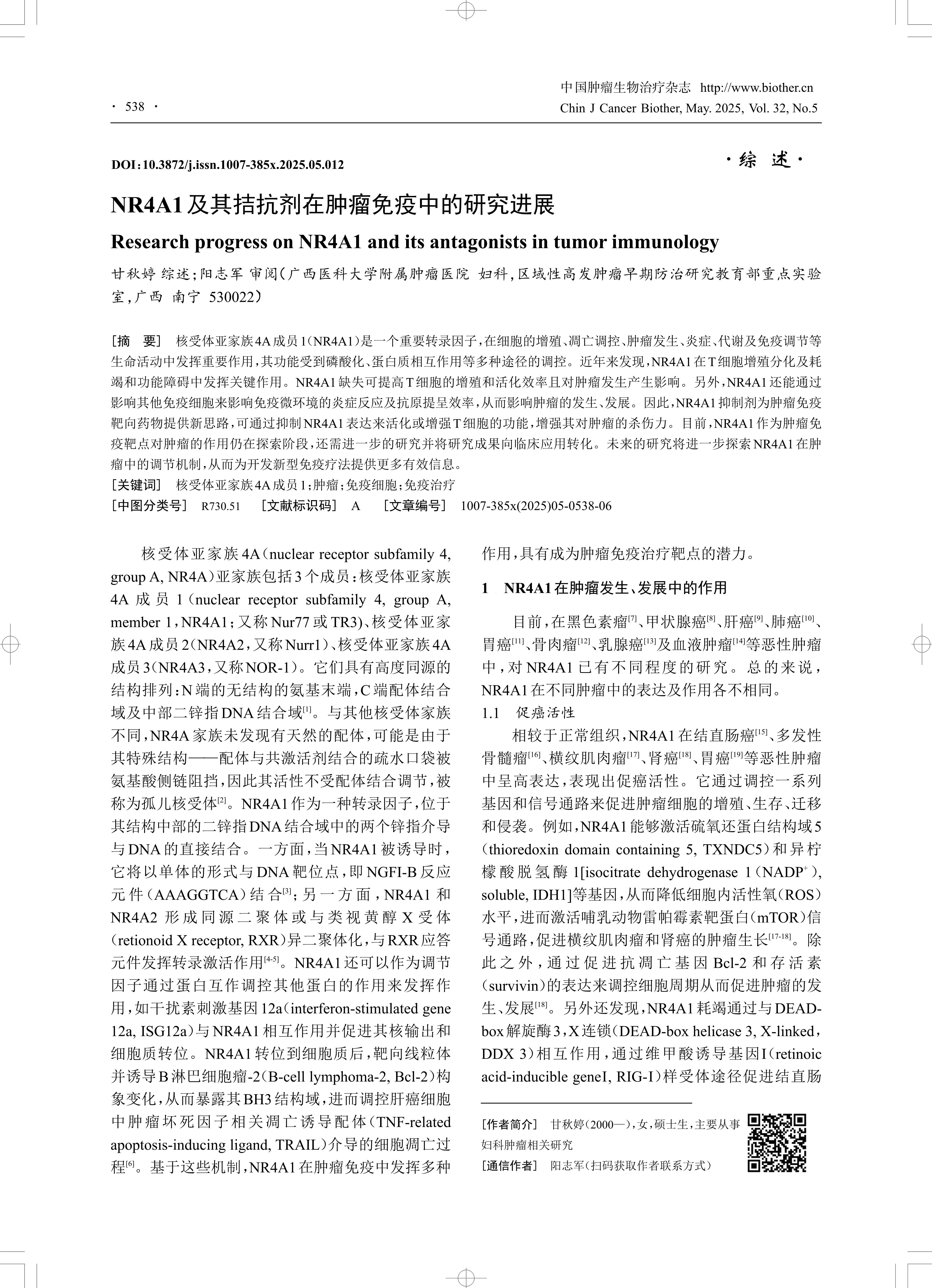 [摘 要] 核受体亚家族4A成员1(NR4A1)是一个重要转录因子,在细胞的增殖、凋亡调控、肿瘤发生、炎症、代谢及免疫调节等 生命活动中发挥重要作用,其功能受到磷酸化、蛋白质相互作用等多种途径的调控。近年来发现,NR4A1在T细胞增殖分化及耗 竭和功能障碍中发挥关键作用。NR4A1缺失可提高T细胞的增殖和活化效率且对肿瘤发生产生影响。另外,NR4A1还能通过 影响其他免疫细胞来影响免疫微环境的炎症反应及抗原提呈效率,从而影响肿瘤的发生、发展。因此,NR4A1抑制剂为肿瘤免疫 靶向药物提供新思路,可通过抑制NR4A1表达来活化或增强T细胞的功能,增强其对肿瘤的杀伤力。目前,NR4A1作为肿瘤免 疫靶点对肿瘤的作用仍在探索阶段,还需进一步的研究并将研究成果向临床应用转化。未来的研究将进一步探索NR4A1在肿 瘤中的调节机制,从而为开发新型免疫疗法提供更多有效信息。