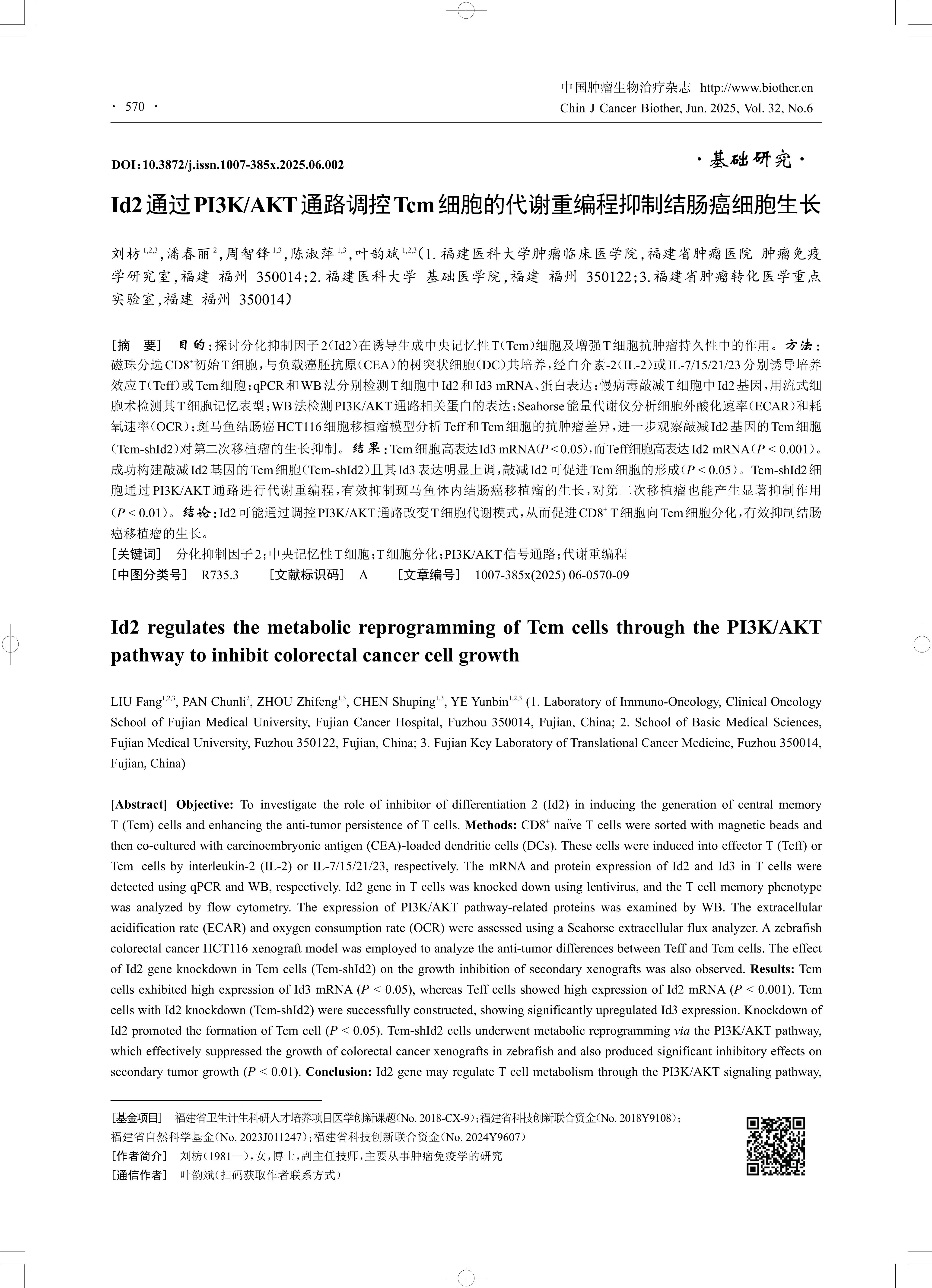 [摘 要] 目的:探讨分化抑制因子2(Id2)在诱导生成中央记忆性T(Tcm)细胞及增强T细胞抗肿瘤持久性中的作用。方法: 磁珠分选CD8+初始T细胞,与负载癌胚抗原(CEA)的树突状细胞(DC)共培养,经白介素-2(IL-2)或IL-7/15/21/23分别诱导培养 效应T(Teff)或Tcm细胞;qPCR和WB法分别检测T细胞中Id2和Id3 mRNA、蛋白表达;慢病毒敲减T细胞中Id2基因,用流式细 胞术检测其T细胞记忆表型;WB法检测PI3K/AKT通路相关蛋白的表达;Seahorse能量代谢仪分析细胞外酸化速率(ECAR)和耗 氧速率(OCR);斑马鱼结肠癌HCT116细胞移植瘤模型分析Teff和Tcm细胞的抗肿瘤差异,进一步观察敲减Id2基因的Tcm细胞 (Tcm-shId2)对第二次移植瘤的生长抑制。结果:Tcm细胞高表达Id3 mRNA(P < 0.05),而Teff细胞高表达Id2 mRNA(P < 0.001)。 成功构建敲减Id2基因的Tcm细胞(Tcm-shId2)且其Id3表达明显上调,敲减Id2可促进Tcm细胞的形成(P < 0.05)。Tcm-shId2细 胞通过PI3K/AKT通路进行代谢重编程,有效抑制斑马鱼体内结肠癌移植瘤的生长,对第二次移植瘤也能产生显著抑制作用 (P < 0.01)。结论:Id2可能通过调控PI3K/AKT通路改变T细胞代谢模式,从而促进CD8+ T细胞向Tcm细胞分化,有效抑制结肠 癌移植瘤的生长。