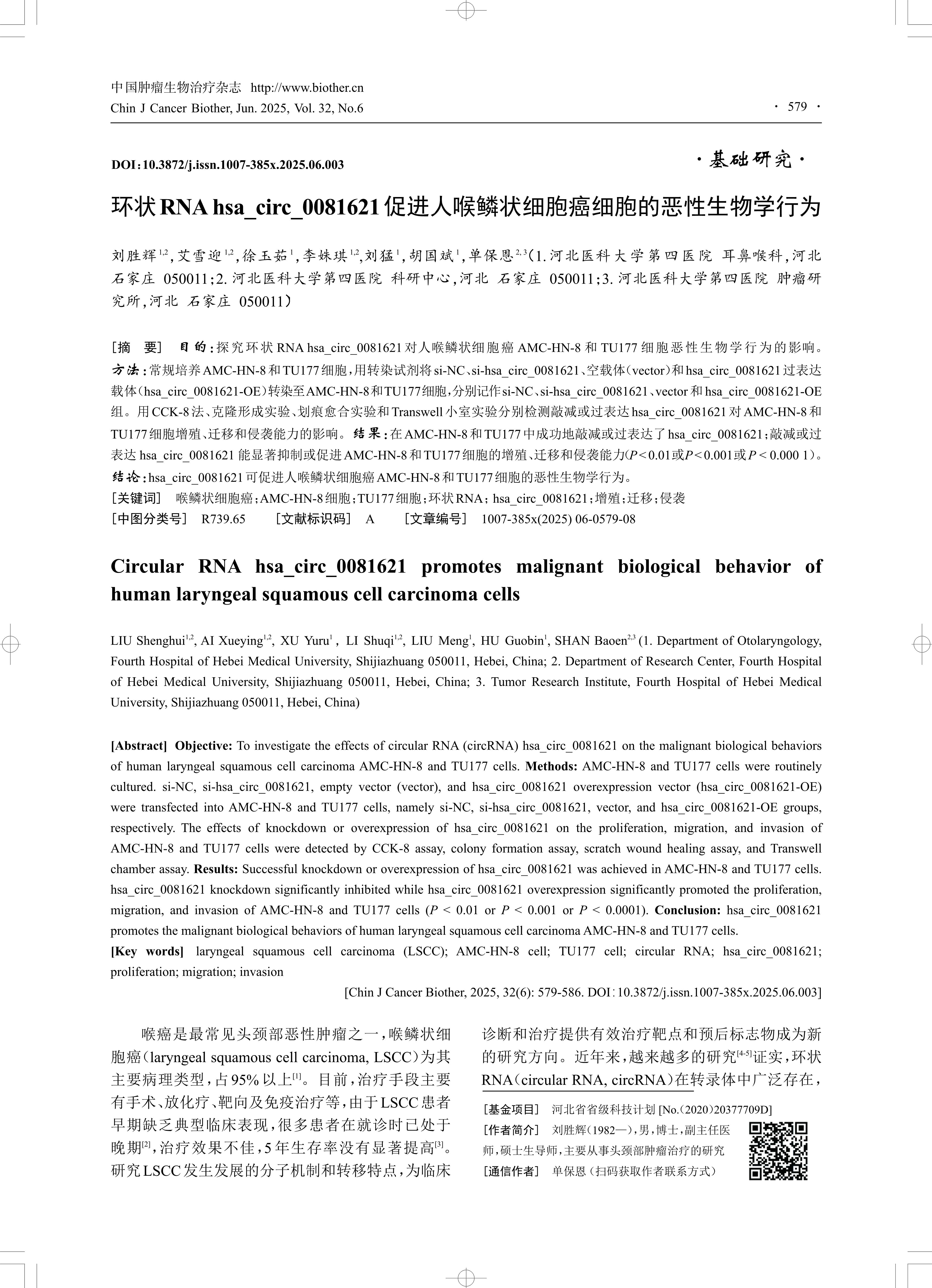 [Abstract] Objective: To investigate the effects of circular RNA (circRNA) hsa_circ_0081621 on the malignant biological behaviors of human laryngeal squamous cell carcinoma AMC-HN-8 and TU177 cells. Methods: AMC-HN-8 and TU177 cells were routinely cultured. si-NC, si-hsa_circ_0081621, empty vector (vector), and hsa_circ_0081621 overexpression vector (hsa_circ_0081621-OE) were transfected into AMC-HN-8 and TU177 cells, namely si-NC, si-hsa_circ_0081621, vector, and hsa_circ_0081621-OE groups, respectively. The effects of knockdown or overexpression of hsa_circ_0081621 on the proliferation, migration, and invasion of AMC-HN-8 and TU177 cells were detected by CCK-8 assay, colony formation assay, scratch wound healing assay, and Transwell chamber assay. Results: Successful knockdown or overexpression of hsa_circ_0081621 was achieved in AMC-HN-8 and TU177 cells. hsa_circ_0081621 knockdown significantly inhibited while hsa_circ_0081621 overexpression significantly promoted the proliferation, migration, and invasion of AMC-HN-8 and TU177 cells (P < 0.01 or P < 0.001 or P < 0.0001). Conclusion: hsa_circ_0081621 promotes the malignant biological behaviors of human laryngeal squamous cell carcinoma AMC-HN-8 and TU177 cells.