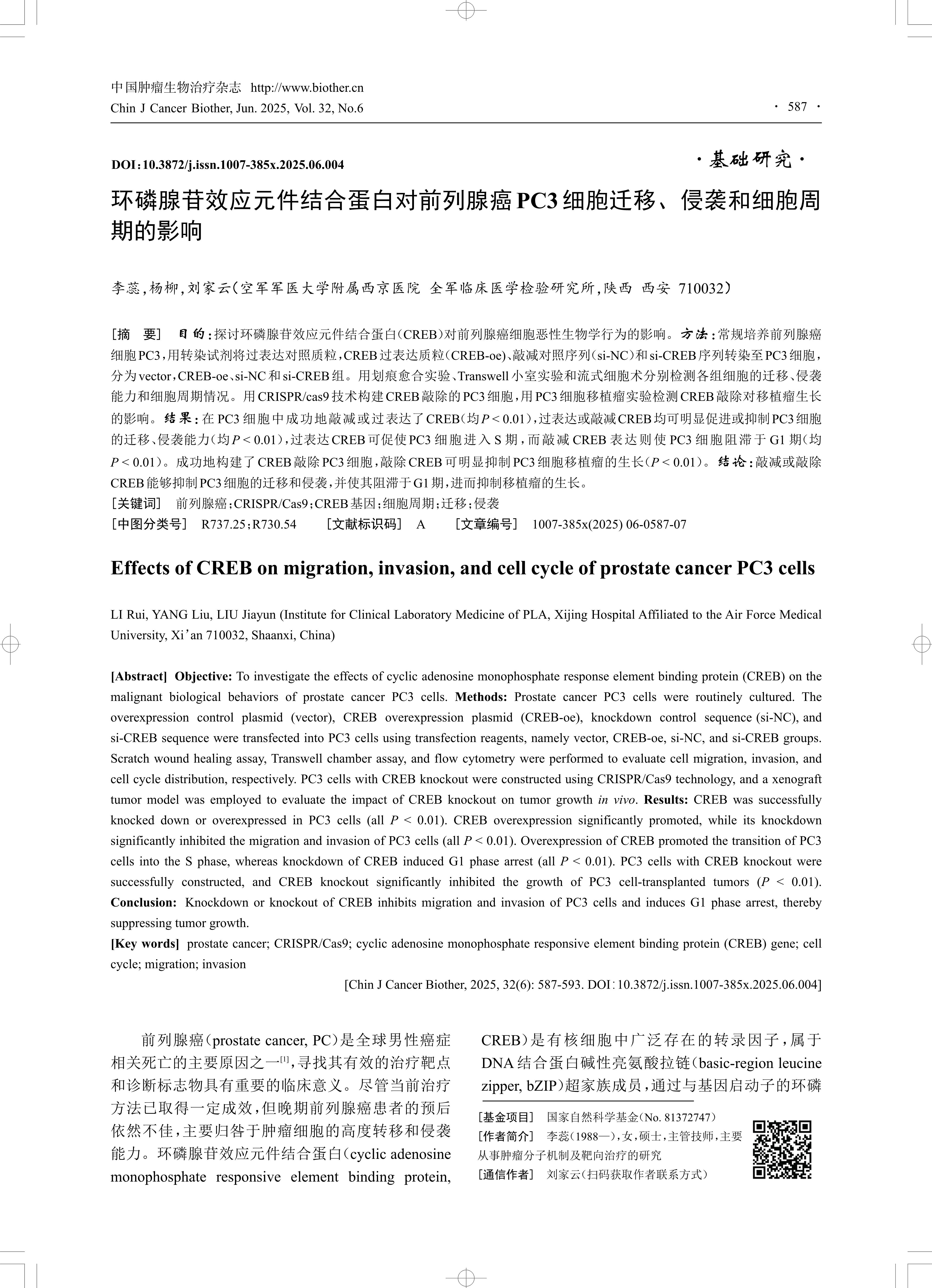 [摘 要] 目的:探讨环磷腺苷效应元件结合蛋白(CREB)对前列腺癌细胞恶性生物学行为的影响。方法:常规培养前列腺癌 细胞PC3,用转染试剂将过表达对照质粒,CREB过表达质粒(CREB-oe)、敲减对照序列(si-NC)和si-CREB序列转染至PC3细胞, 分为vector,CREB-oe、si-NC和si-CREB组。用划痕愈合实验、Transwell小室实验和流式细胞术分别检测各组细胞的迁移、侵袭 能力和细胞周期情况。用CRISPR/cas9技术构建CREB敲除的PC3细胞,用PC3细胞移植瘤实验检测CREB敲除对移植瘤生长 的影响。结果:在PC3细胞中成功地敲减或过表达了CREB(均P < 0.01),过表达或敲减CREB均可明显促进或抑制PC3细胞 的迁移、侵袭能力(均P < 0.01),过表达CREB可促使PC3细胞进入S期,而敲减CREB表达则使PC3细胞阻滞于G1期(均 P < 0.01)。成功地构建了CREB敲除PC3细胞,敲除CREB可明显抑制PC3细胞移植瘤的生长(P < 0.01)。结论:敲减或敲除 CREB能够抑制PC3细胞的迁移和侵袭,并使其阻滞于G1期,进而抑制移植瘤的生长。