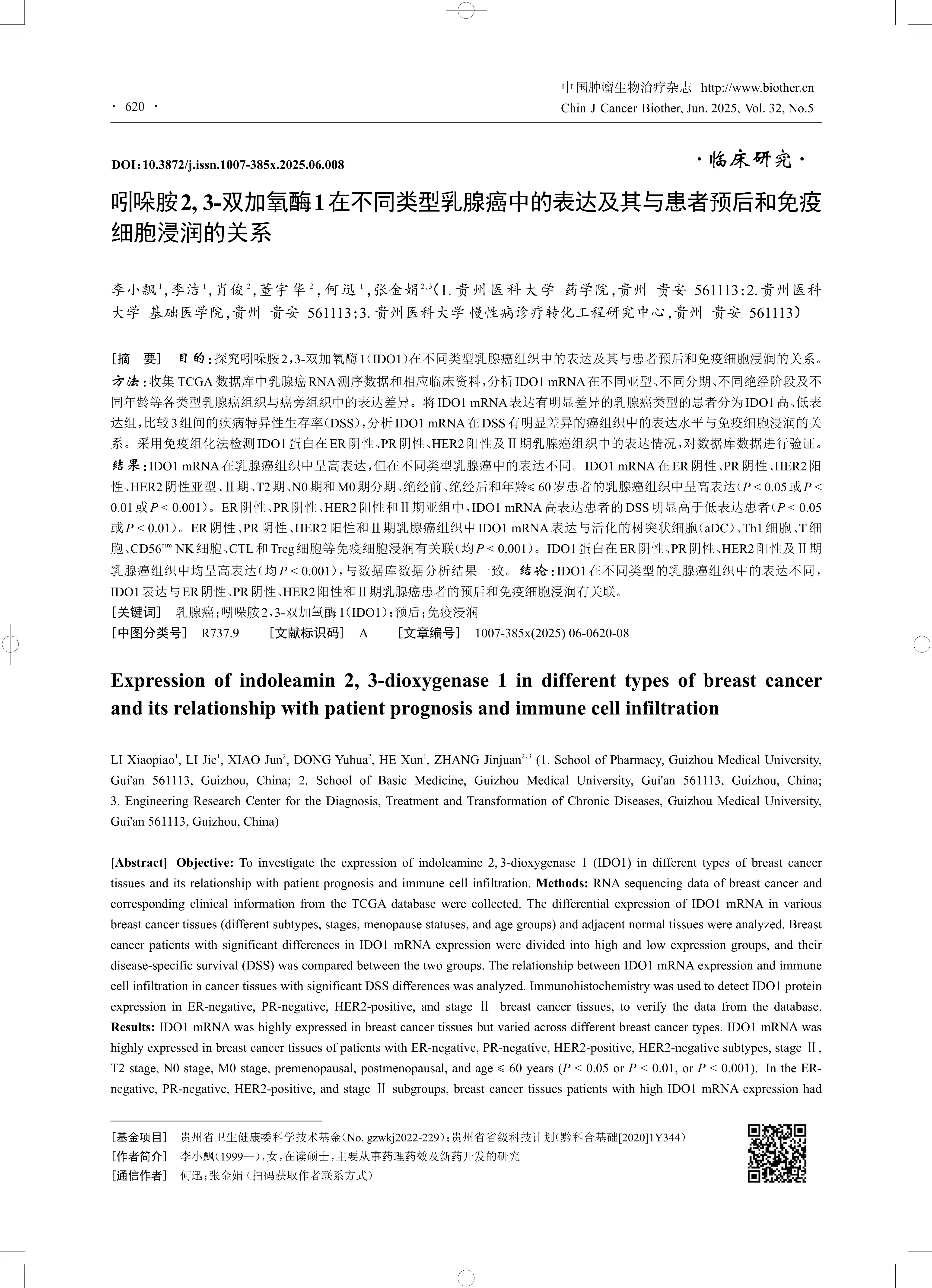 [Abstract] Objective: To investigate the expression of indoleamine 2,3-dioxygenase 1 (IDO1) in different types of breast cancer tissues and its relationship with patient prognosis and immune cell infiltration. Methods: RNA sequencing data of breast cancer and corresponding clinical information from the TCGA database were collected. The differential expression of IDO1 mRNA in various breast cancer tissues (different subtypes, stages, menopause statuses, and age groups) and adjacent normal tissues were analyzed. Breast cancer patients with significant differences in IDO1 mRNA expression were divided into high and low expression groups, and their disease-specific survival (DSS) was compared between the two groups. The relationship between IDO1 mRNA expression and immune cell infiltration in cancer tissues with significant DSS differences was analyzed. Immunohistochemistry was used to detect IDO1 protein expression in ER-negative, PR-negative, HER2-positive, and stage Ⅱ breast cancer tissues, to verify the data from the database. Results: IDO1 mRNA was highly expressed in breast cancer tissues but varied across different breast cancer types. IDO1 mRNA was highly expressed in breast cancer tissues of patients with ER-negative, PR-negative, HER2-positive, HER2-negative subtypes, stage Ⅱ, T2 stage, N0 stage, M0 stage, premenopausal, postmenopausal, and age ≤ 60 years (P < 0.05 or P < 0.01, or P < 0.001). In the ER negative, PR-negative, HER2-positive, and stage Ⅱ subgroups, breast cancer tissues patients with high IDO1 mRNA expression had significantly higher DSS than those with low expression (P < 0.05 or P < 0.01). In ER-negative, PR-negative, HER2-positive, and stage Ⅱ breast cancer tissues, IDO1 mRNA expression was associated with immune cell infiltration, including activated dendritic cells (aDCs), Th1 cells, T cells, CD56dim NK cells, CTLs, and Treg cells (all P < 0.001). IDO1 protein was highly expressed in ER-negative, PR-negative, HER2-positive, and stage Ⅱ breast cancer tissues (all P < 0.001), consistent with the data from the database. Conclusion: IDO1 expression varies across different types of breast cancer tissues. The expression of IDO1 is associated with the prognosis and immune cell infiltration in ER-negative, PR-negative, HER2-positive, and at stage Ⅱ breast cancer patients.