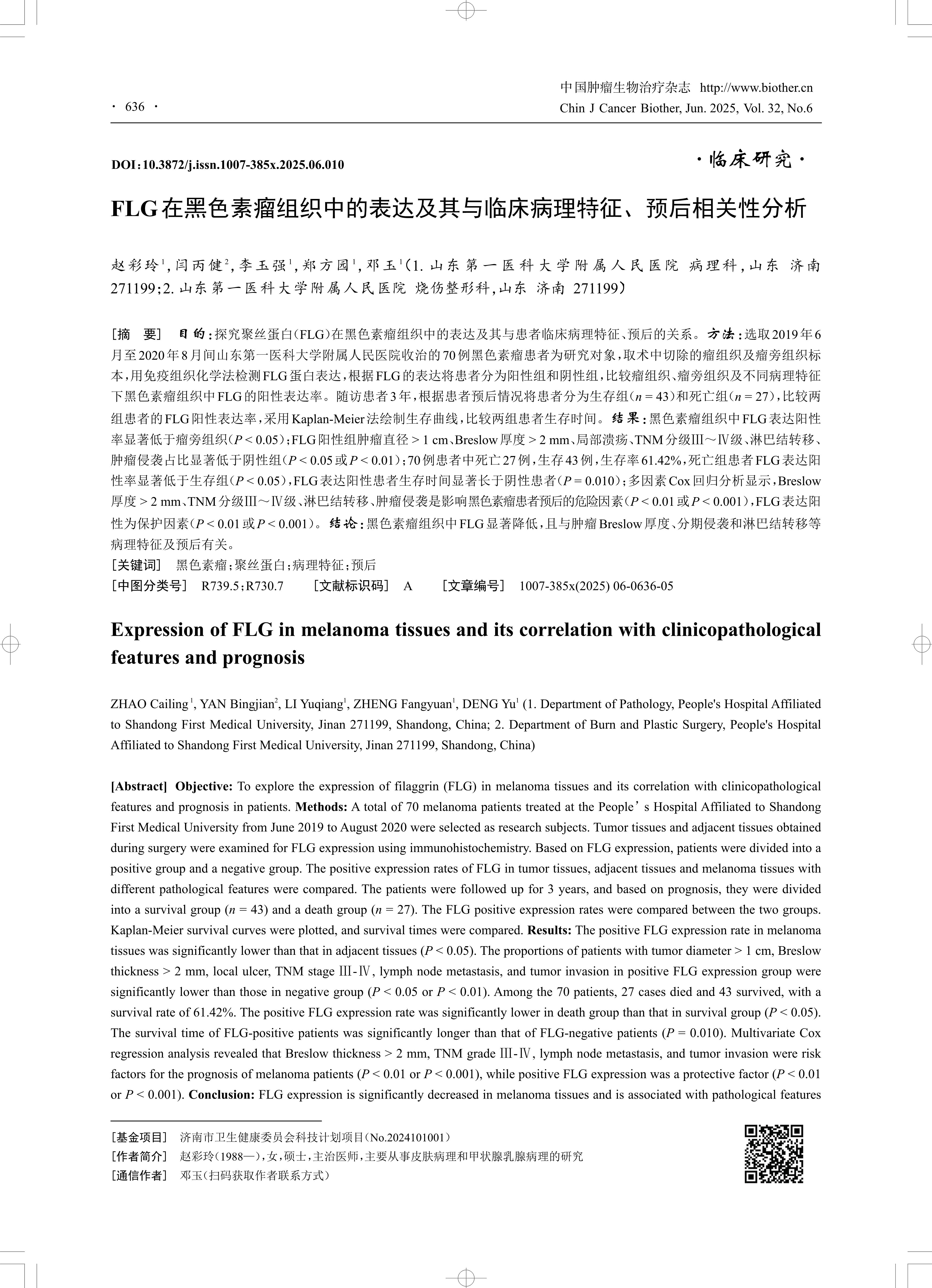 [Abstract] Objective: To explore the expression of filaggrin (FLG) in melanoma tissues and its correlation with clinicopathological features and prognosis in patients. Methods: A total of 70 melanoma patients treated at the People’ s Hospital Affiliated to Shandong First Medical University from June 2019 to August 2020 were selected as research subjects. Tumor tissues and adjacent tissues obtained during surgery were examined for FLG expression using immunohistochemistry. Based on FLG expression, patients were divided into a positive group and a negative group. The positive expression rates of FLG in tumor tissues, adjacent tissues and melanoma tissues with different pathological features were compared. The patients were followed up for 3 years, and based on prognosis, they were divided into a survival group (n = 43) and a death group (n = 27). The FLG positive expression rates were compared between the two groups. Kaplan-Meier survival curves were plotted, and survival times were compared. Results: The positive FLG expression rate in melanoma tissues was significantly lower than that in adjacent tissues (P < 0.05). The proportions of patients with tumor diameter > 1 cm, Breslow thickness > 2 mm, local ulcer, TNM stage Ⅲ-Ⅳ, lymph node metastasis, and tumor invasion in positive FLG expression group were significantly lower than those in negative group (P < 0.05 or P < 0.01). Among the 70 patients, 27 cases died and 43 survived, with a survival rate of 61.42%. The positive FLG expression rate was significantly lower in death group than that in survival group (P < 0.05). The survival time of FLG-positive patients was significantly longer than that of FLG-negative patients (P = 0.010). Multivariate Cox regression analysis revealed that Breslow thickness > 2 mm, TNM grade Ⅲ-Ⅳ, lymph node metastasis, and tumor invasion were risk factors for the prognosis of melanoma patients (P < 0.01 or P < 0.001), while positive FLG expression was a protective factor (P < 0.01 or P < 0.001). Conclusion: FLG expression is significantly decreased in melanoma tissues and is associated with pathological features such as Breslow thickness, tumor stage, invasion, lymph node metastasis, and prognosis.