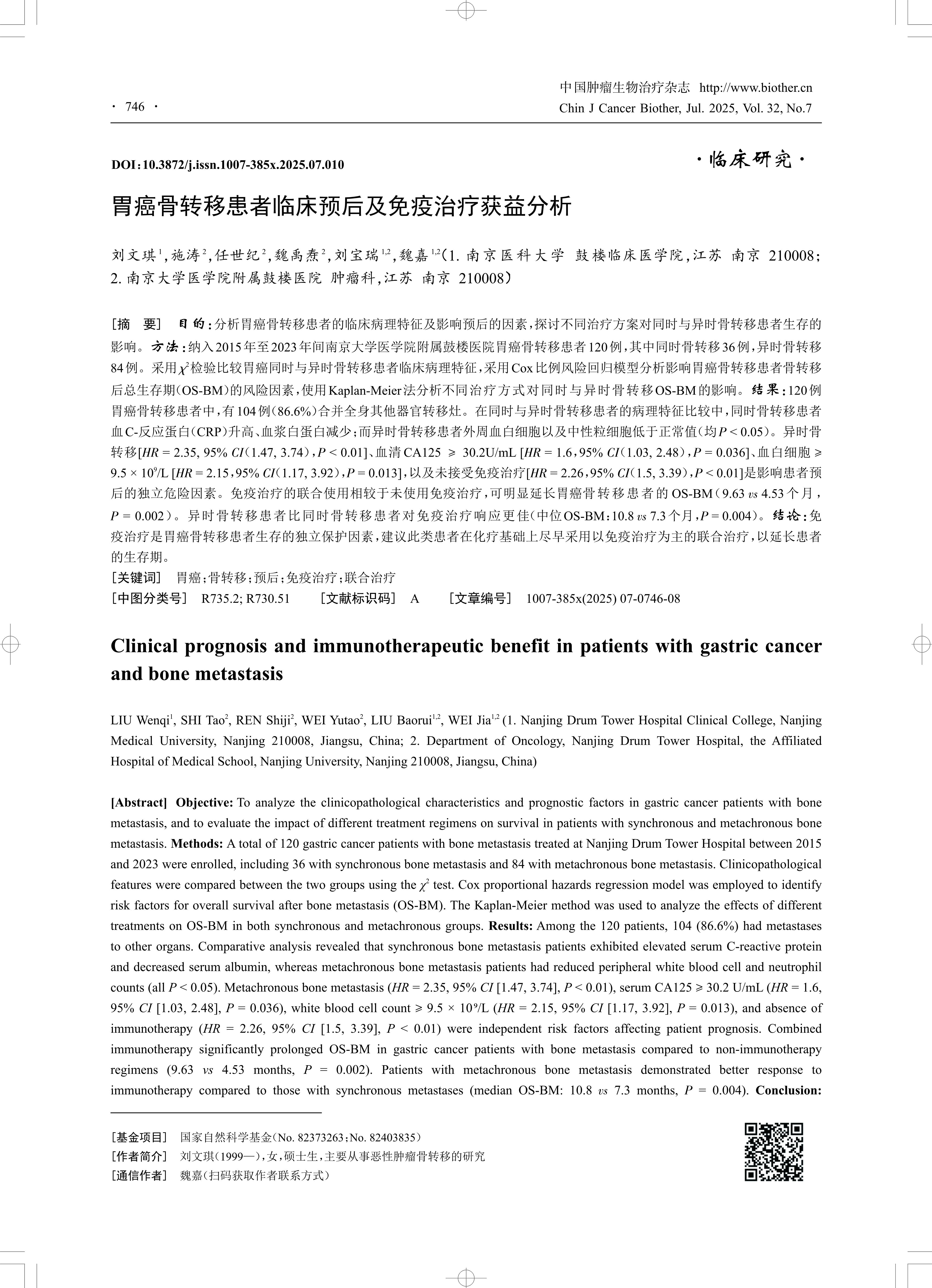 [摘 要] 目的:分析胃癌骨转移患者的临床病理特征及影响预后的因素,探讨不同治疗方案对同时与异时骨转移患者生存的 影响。方法:纳入2015年至2023年间南京大学医学院附属鼓楼医院胃癌骨转移患者120例,其中同时骨转移36例,异时骨转移 84例。采用χ2检验比较胃癌同时与异时骨转移患者临床病理特征,采用Cox比例风险回归模型分析影响胃癌骨转移患者骨转移 后总生存期(OS-BM)的风险因素,使用Kaplan-Meier法分析不同治疗方式对同时与异时骨转移OS-BM的影响。结果:120例 胃癌骨转移患者中,有104例(86.6%)合并全身其他器官转移灶。在同时与异时骨转移患者的病理特征比较中,同时骨转移患者 血C-反应蛋白(CRP)升高、血浆白蛋白减少;而异时骨转移患者外周血白细胞以及中性粒细胞低于正常值(均P < 0.05)。异时骨 转移[HR = 2.35, 95% CI(1.47, 3.74),P < 0.01]、血清CA125 ≥ 30.2U/mL [HR = 1.6,95% CI(1.03, 2.48),P = 0.036]、血白细胞 ≥ 9.5 × 109/L [HR = 2.15,95% CI(1.17, 3.92),P = 0.013],以及未接受免疫治疗[HR = 2.26,95% CI(1.5, 3.39),P < 0.01]是影响患者预 后的独立危险因素。免疫治疗的联合使用相较于未使用免疫治疗,可明显延长胃癌骨转移患者的OS-BM(9.63 vs 4.53个月, P = 0.002)。异时骨转移患者比同时骨转移患者对免疫治疗响应更佳(中位OS-BM:10.8 vs 7.3个月,P = 0.004)。结论:免 疫治疗是胃癌骨转移患者生存的独立保护因素,建议此类患者在化疗基础上尽早采用以免疫治疗为主的联合治疗,以延长患者 的生存期。