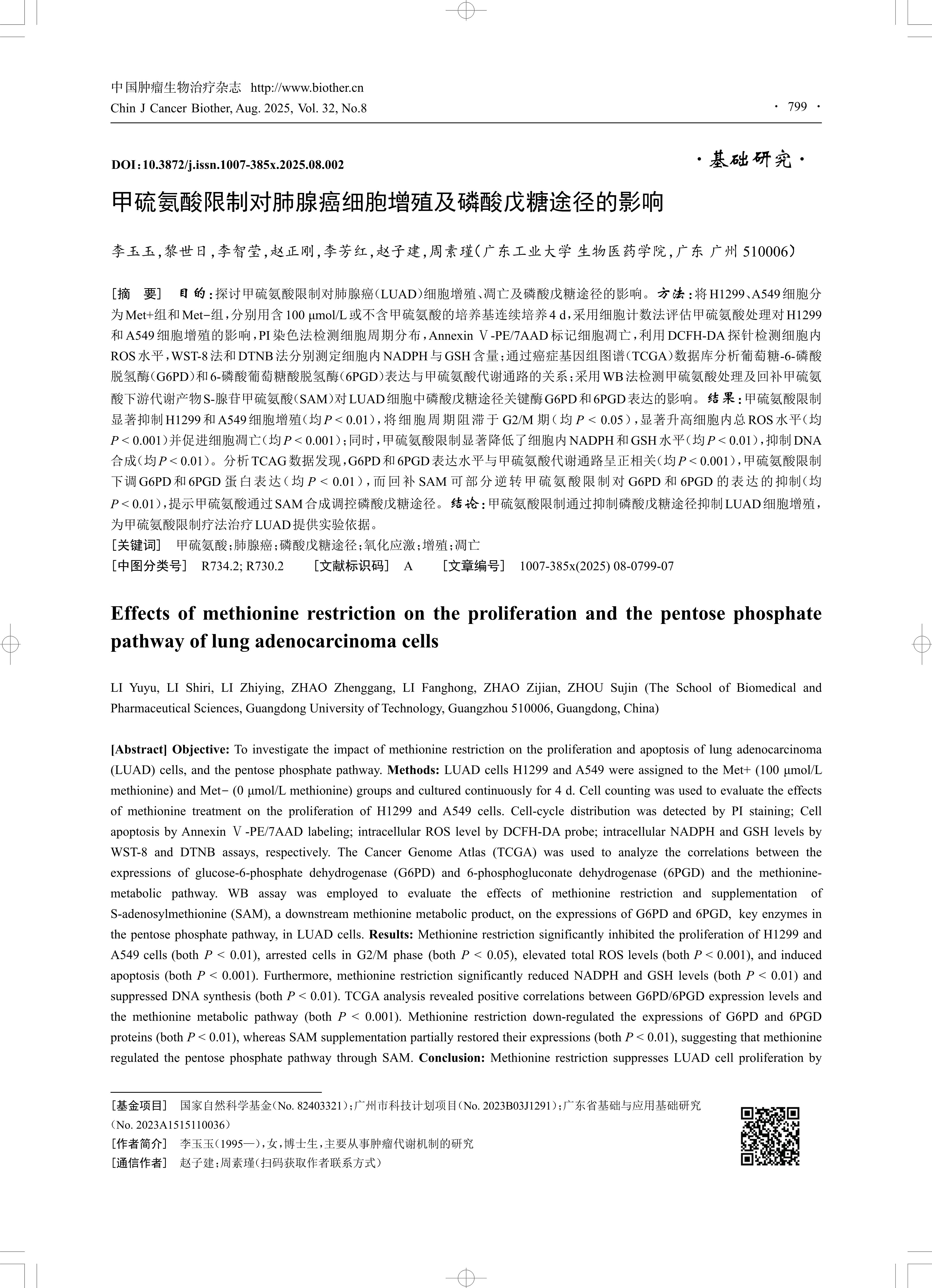 [摘 要] 目的:探讨甲硫氨酸限制对肺腺癌(LUAD)细胞增殖、凋亡及磷酸戊糖途径的影响。方法:将H1299、A549细胞分 为Met+组和Met?组,分别用含100 μmol/L或不含甲硫氨酸的培养基连续培养4 d,采用细胞计数法评估甲硫氨酸处理对H1299 和 A549 细胞增殖的影响,PI 染色法检测细胞周期分布,Annexin Ⅴ-PE/7AAD 标记细胞凋亡,利用 DCFH-DA 探针检测细胞内 ROS水平,WST-8法和DTNB法分别测定细胞内NADPH与GSH含量;通过癌症基因组图谱(TCGA)数据库分析葡萄糖-6-磷酸 脱氢酶(G6PD)和6-磷酸葡萄糖酸脱氢酶(6PGD)表达与甲硫氨酸代谢通路的关系;采用WB法检测甲硫氨酸处理及回补甲硫氨 酸下游代谢产物S-腺苷甲硫氨酸(SAM)对LUAD细胞中磷酸戊糖途径关键酶G6PD和6PGD表达的影响。结果:甲硫氨酸限制 显著抑制H1299和A549细胞增殖(均P < 0.01),将细胞周期阻滞于 G2/M 期(均 P < 0.05),显著升高细胞内总ROS水平(均 P < 0.001)并促进细胞凋亡(均P < 0.001);同时,甲硫氨酸限制显著降低了细胞内NADPH和GSH水平(均P < 0.01),抑制DNA 合成(均P < 0.01)。分析TCAG数据发现,G6PD和6PGD表达水平与甲硫氨酸代谢通路呈正相关(均P < 0.001),甲硫氨酸限制 下调G6PD和6PGD 蛋白表达(均 P < 0.01),而回补 SAM 可部分逆转甲硫氨酸限制对 G6PD 和 6PGD 的表达的抑制(均 P < 0.01),提示甲硫氨酸通过SAM合成调控磷酸戊糖途径。结论:甲硫氨酸限制通过抑制磷酸戊糖途径抑制LUAD细胞增殖, 为甲硫氨酸限制疗法治疗LUAD提供实验依据。