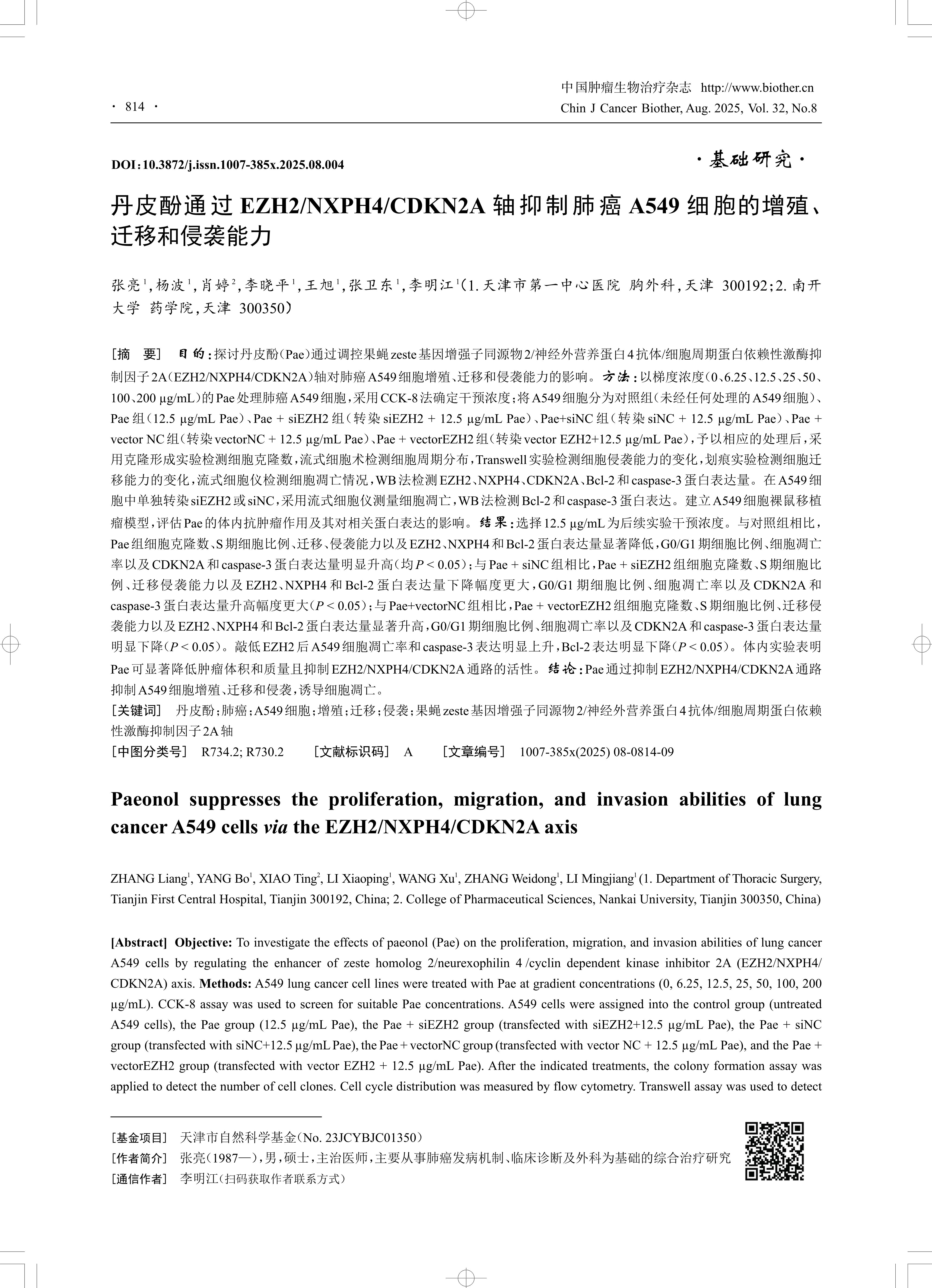 [摘 要] 目的:探讨丹皮酚(Pae)通过调控果蝇zeste基因增强子同源物2/神经外营养蛋白4抗体/细胞周期蛋白依赖性激酶抑 制因子2A(EZH2/NXPH4/CDKN2A)轴对肺癌A549细胞增殖、迁移和侵袭能力的影响。方法:以梯度浓度(0、6.25、12.5、25、50、 100、200 μg/mL)的Pae处理肺癌A549细胞,采用CCK-8法确定干预浓度;将A549细胞分为对照组(未经任何处理的A549细胞)、 Pae 组(12.5 μg/mL Pae)、Pae + siEZH2组(转染siEZH2 + 12.5 μg/mL Pae)、Pae+siNC组(转染siNC + 12.5 μg/mL Pae)、Pae + vector NC组(转染vectorNC + 12.5 μg/mL Pae)、Pae + vectorEZH2组(转染vector EZH2+12.5 μg/mL Pae),予以相应的处理后,采 用克隆形成实验检测细胞克隆数,流式细胞术检测细胞周期分布,Transwell实验检测细胞侵袭能力的变化,划痕实验检测细胞迁 移能力的变化,流式细胞仪检测细胞凋亡情况,WB法检测EZH2、NXPH4、CDKN2A、Bcl-2和caspase-3蛋白表达量。在A549细 胞中单独转染siEZH2或siNC,采用流式细胞仪测量细胞凋亡,WB法检测Bcl-2和caspase-3蛋白表达。建立A549细胞裸鼠移植 瘤模型,评估Pae的体内抗肿瘤作用及其对相关蛋白表达的影响。结果:选择12.5 μg/mL为后续实验干预浓度。与对照组相比, Pae组细胞克隆数、S期细胞比例、迁移、侵袭能力以及EZH2、NXPH4和Bcl-2蛋白表达量显著降低,G0/G1期细胞比例、细胞凋亡 率以及CDKN2A和caspase-3蛋白表达量明显升高(均P < 0.05);与Pae + siNC组相比,Pae + siEZH2组细胞克隆数、S期细胞比 例、迁移侵袭能力以及EZH2、NXPH4和Bcl-2蛋白表达量下降幅度更大,G0/G1期细胞比例、细胞凋亡率以及CDKN2A和 caspase-3蛋白表达量升高幅度更大(P < 0.05);与Pae+vectorNC组相比,Pae + vectorEZH2组细胞克隆数、S期细胞比例、迁移侵 袭能力以及EZH2、NXPH4和Bcl-2蛋白表达量显著升高,G0/G1期细胞比例、细胞凋亡率以及CDKN2A和caspase-3蛋白表达量 明显下降(P < 0.05)。敲低EZH2后A549细胞凋亡率和caspase-3表达明显上升,Bcl-2表达明显下降(P < 0.05)。体内实验表明 Pae可显著降低肿瘤体积和质量且抑制EZH2/NXPH4/CDKN2A通路的活性。结论:Pae通过抑制EZH2/NXPH4/CDKN2A通路 抑制A549细胞增殖、迁移和侵袭,诱导细胞凋亡。