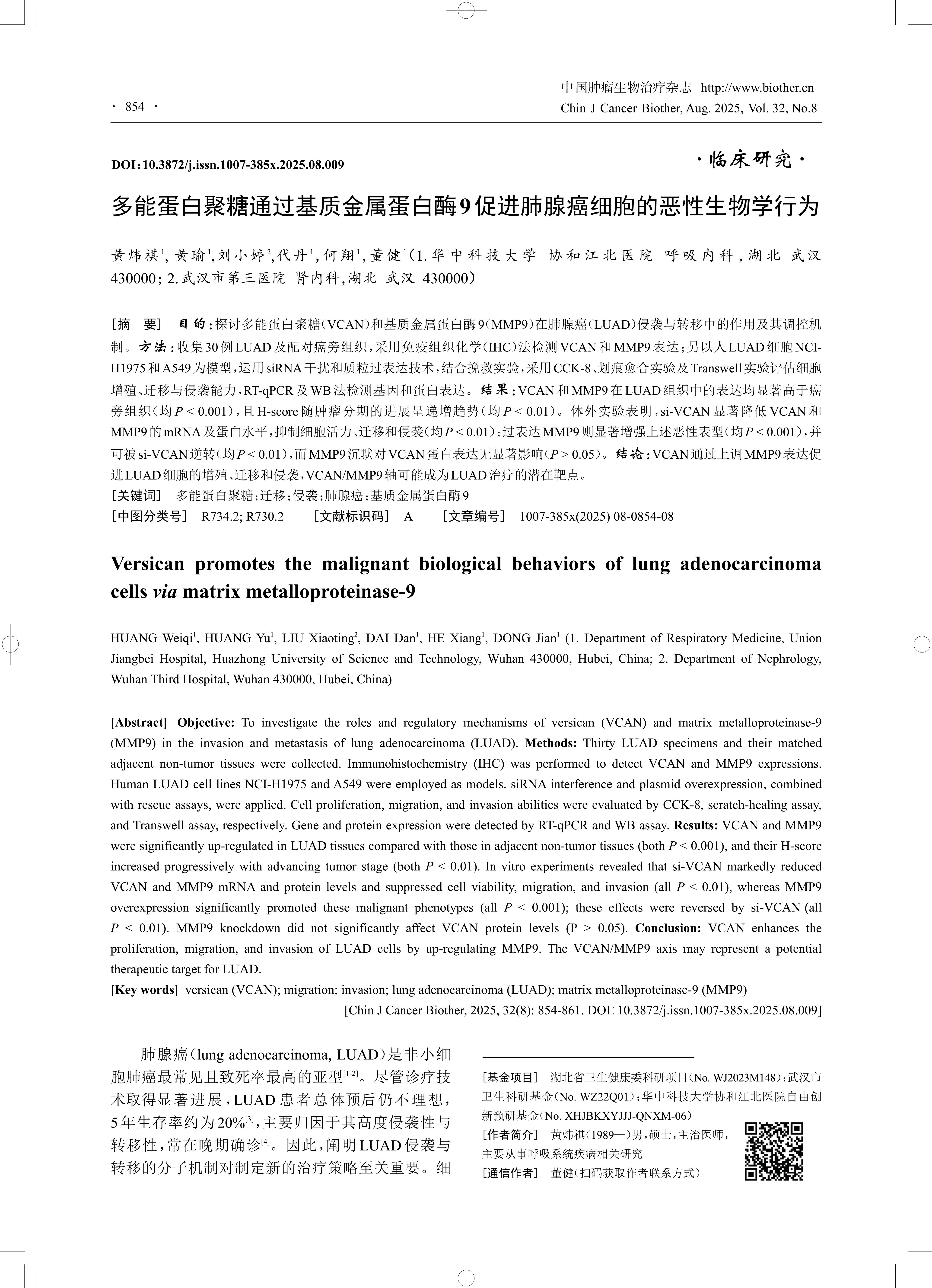 [摘 要] 目的:探讨多能蛋白聚糖(VCAN)和基质金属蛋白酶9(MMP9)在肺腺癌(LUAD)侵袭与转移中的作用及其调控机 制。方法:收集30例LUAD及配对癌旁组织,采用免疫组织化学(IHC)法检测VCAN和MMP9表达;另以人LUAD细胞NCI H1975和A549为模型,运用siRNA干扰和质粒过表达技术,结合挽救实验,采用CCK-8、划痕愈合实验及Transwell实验评估细胞 增殖、迁移与侵袭能力,RT-qPCR及WB法检测基因和蛋白表达。结果:VCAN和MMP9在LUAD组织中的表达均显著高于癌 旁组织(均P < 0.001),且H-score随肿瘤分期的进展呈递增趋势(均P < 0.01)。体外实验表明,si-VCAN显著降低VCAN和 MMP9的mRNA及蛋白水平,抑制细胞活力、迁移和侵袭(均P < 0.01);过表达MMP9则显著增强上述恶性表型(均P < 0.001),并 可被si-VCAN逆转(均P < 0.01),而MMP9沉默对VCAN蛋白表达无显著影响(P > 0.05)。结论:VCAN通过上调MMP9表达促 进LUAD细胞的增殖、迁移和侵袭,VCAN/MMP9轴可能成为LUAD治疗的潜在靶点。