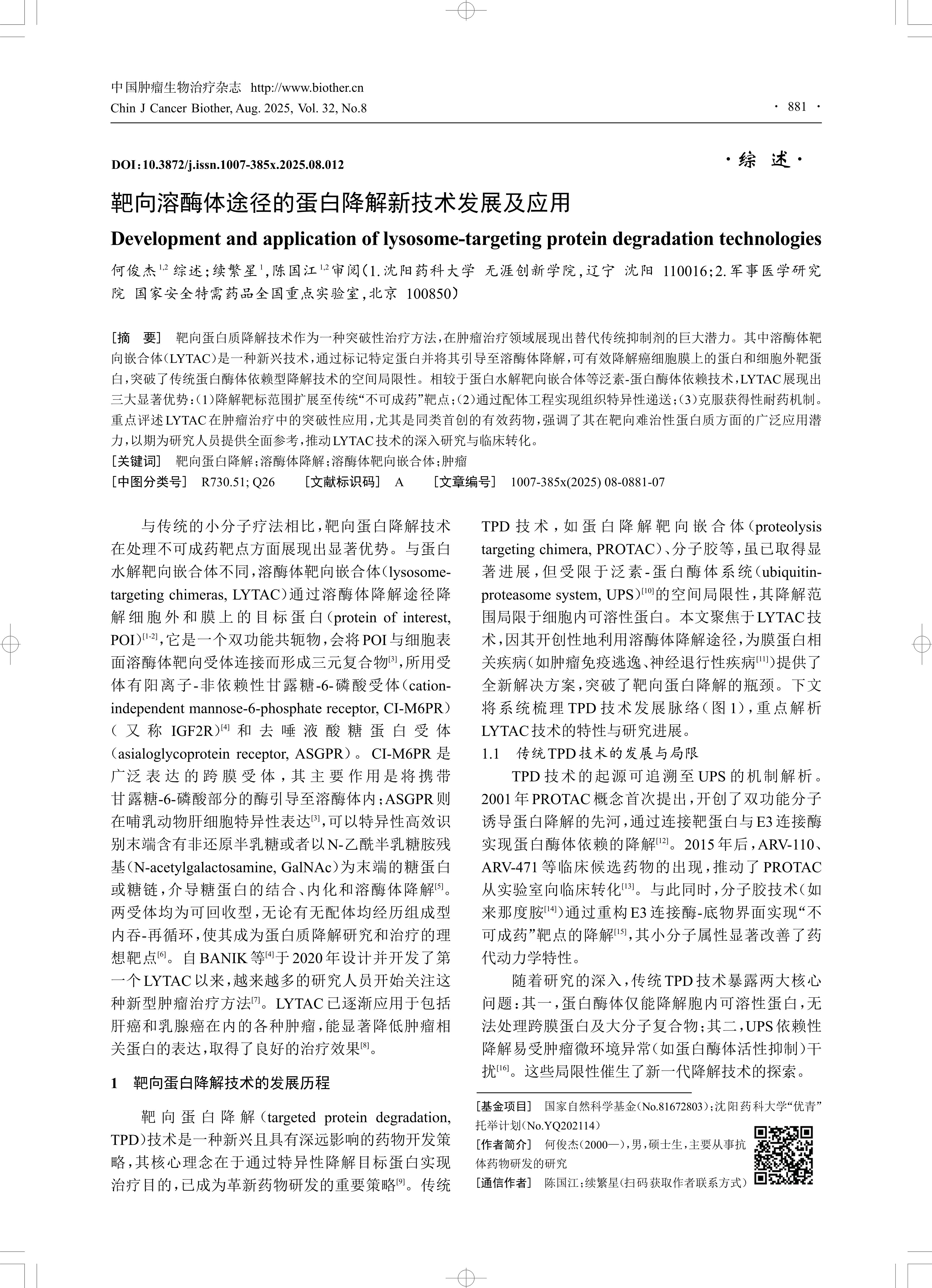 [摘 要] 靶向蛋白质降解技术作为一种突破性治疗方法,在肿瘤治疗领域展现出替代传统抑制剂的巨大潜力。其中溶酶体靶 向嵌合体(LYTAC)是一种新兴技术,通过标记特定蛋白并将其引导至溶酶体降解,可有效降解癌细胞膜上的蛋白和细胞外靶蛋 白,突破了传统蛋白酶体依赖型降解技术的空间局限性。相较于蛋白水解靶向嵌合体等泛素-蛋白酶体依赖技术,LYTAC展现出 三大显著优势:(1)降解靶标范围扩展至传统“不可成药”靶点;(2)通过配体工程实现组织特异性递送;(3)克服获得性耐药机制。 重点评述LYTAC在肿瘤治疗中的突破性应用,尤其是同类首创的有效药物,强调了其在靶向难治性蛋白质方面的广泛应用潜 力,以期为研究人员提供全面参考,推动LYTAC技术的深入研究与临床转化。