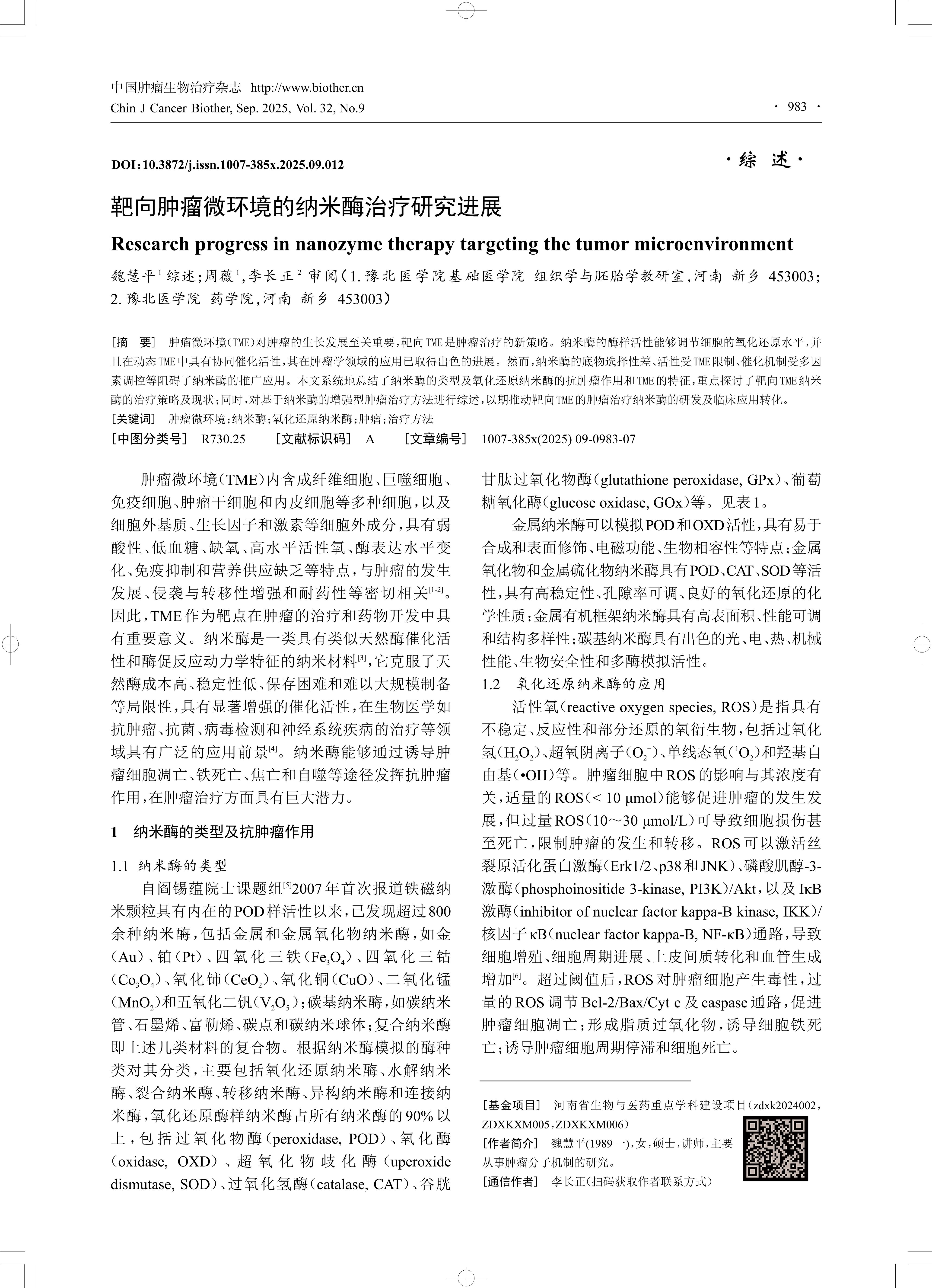[摘 要] 肿瘤微环境(TME)对肿瘤的生长发展至关重要,靶向TME是肿瘤治疗的新策略。纳米酶的酶样活性能够调节细胞的氧化还原水平,并 且在动态TME中具有协同催化活性,其在肿瘤学领域的应用已取得出色的进展。然而,纳米酶的底物选择性差、活性受TME限制、催化机制受多因 素调控等阻碍了纳米酶的推广应用。本文系统地总结了纳米酶的类型及氧化还原纳米酶的抗肿瘤作用和TME的特征,重点探讨了靶向TME纳米 酶的治疗策略及现状;同时,对基于纳米酶的增强型肿瘤治疗方法进行综述,以期推动靶向TME的肿瘤治疗纳米酶的研发及临床应用转化。