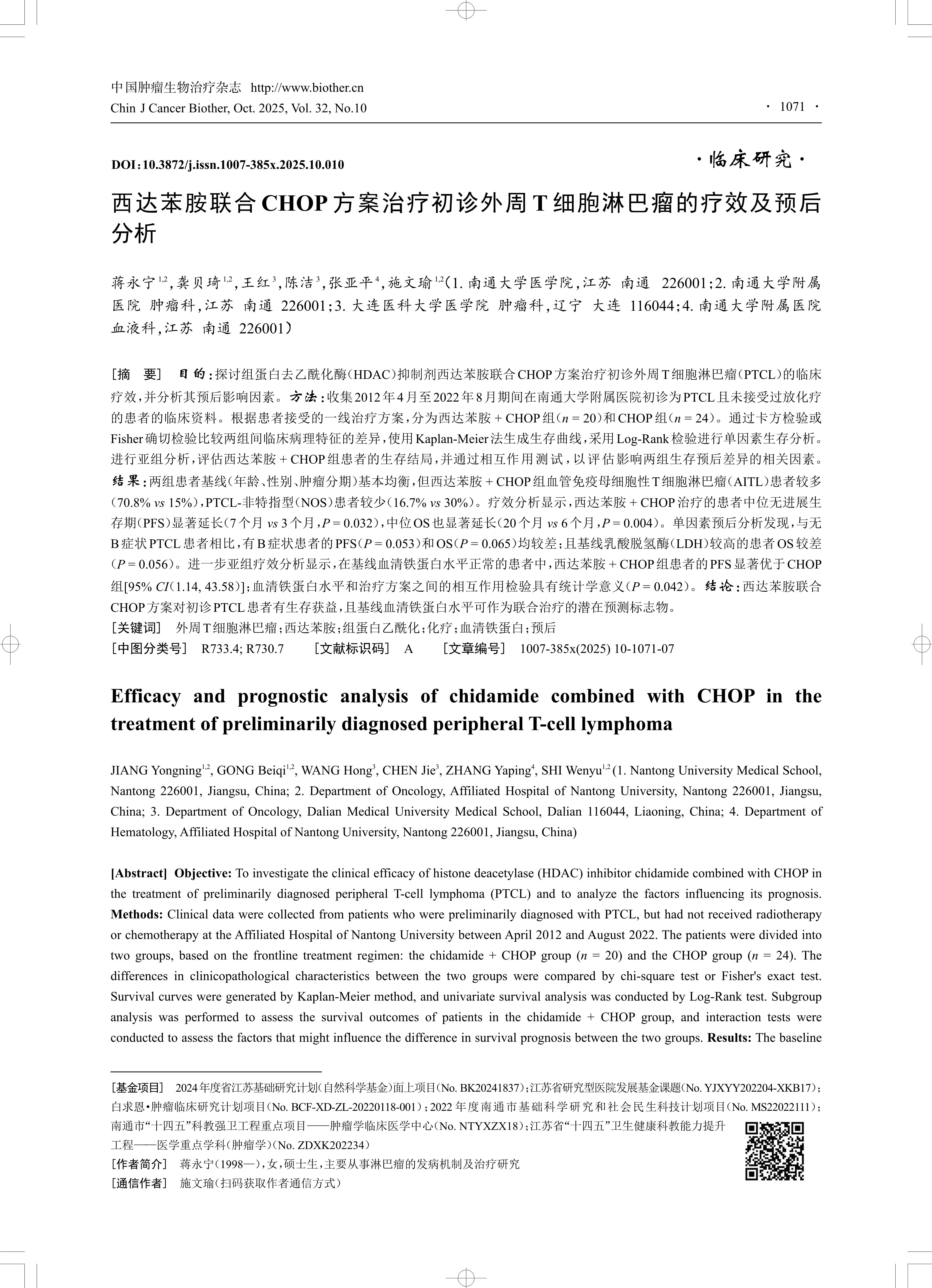 [摘 要] 目的:探讨组蛋白去乙酰化酶(HDAC)抑制剂西达苯胺联合CHOP方案治疗初诊外周T细胞淋巴瘤(PTCL)的临床 疗效,并分析其预后影响因素。方法:收集2012年4月至2022年8月期间在南通大学附属医院初诊为PTCL且未接受过放化疗 的患者的临床资料。根据患者接受的一线治疗方案,分为西达苯胺 + CHOP组(n = 20)和CHOP组(n = 24)。通过卡方检验或 Fisher确切检验比较两组间临床病理特征的差异,使用Kaplan-Meier法生成生存曲线,采用Log-Rank检验进行单因素生存分析。 进行亚组分析,评估西达苯胺 + CHOP组患者的生存结局,并通过相互作用测试 ,以评估影响两组生存预后差异的相关因素。 结果:两组患者基线(年龄、性别、肿瘤分期)基本均衡,但西达苯胺 + CHOP组血管免疫母细胞性T细胞淋巴瘤(AITL)患者较多 (70.8% vs 15%),PTCL-非特指型(NOS)患者较少(16.7% vs 30%)。疗效分析显示,西达苯胺 + CHOP治疗的患者中位无进展生 存期(PFS)显著延长(7个月 vs 3个月,P = 0.032),中位OS也显著延长(20个月 vs 6个月,P = 0.004)。单因素预后分析发现,与无 B症状PTCL患者相比,有B症状患者的PFS(P = 0.053)和OS(P = 0.065)均较差;且基线乳酸脱氢酶(LDH)较高的患者OS较差 (P = 0.056)。进一步亚组疗效分析显示,在基线血清铁蛋白水平正常的患者中,西达苯胺 + CHOP组患者的PFS显著优于CHOP 组[95% C(I 1.14, 43.58)];血清铁蛋白水平和治疗方案之间的相互作用检验具有统计学意义(P = 0.042)。结论:西达苯胺联合 CHOP方案对初诊PTCL患者有生存获益,且基线血清铁蛋白水平可作为联合治疗的潜在预测标志物。