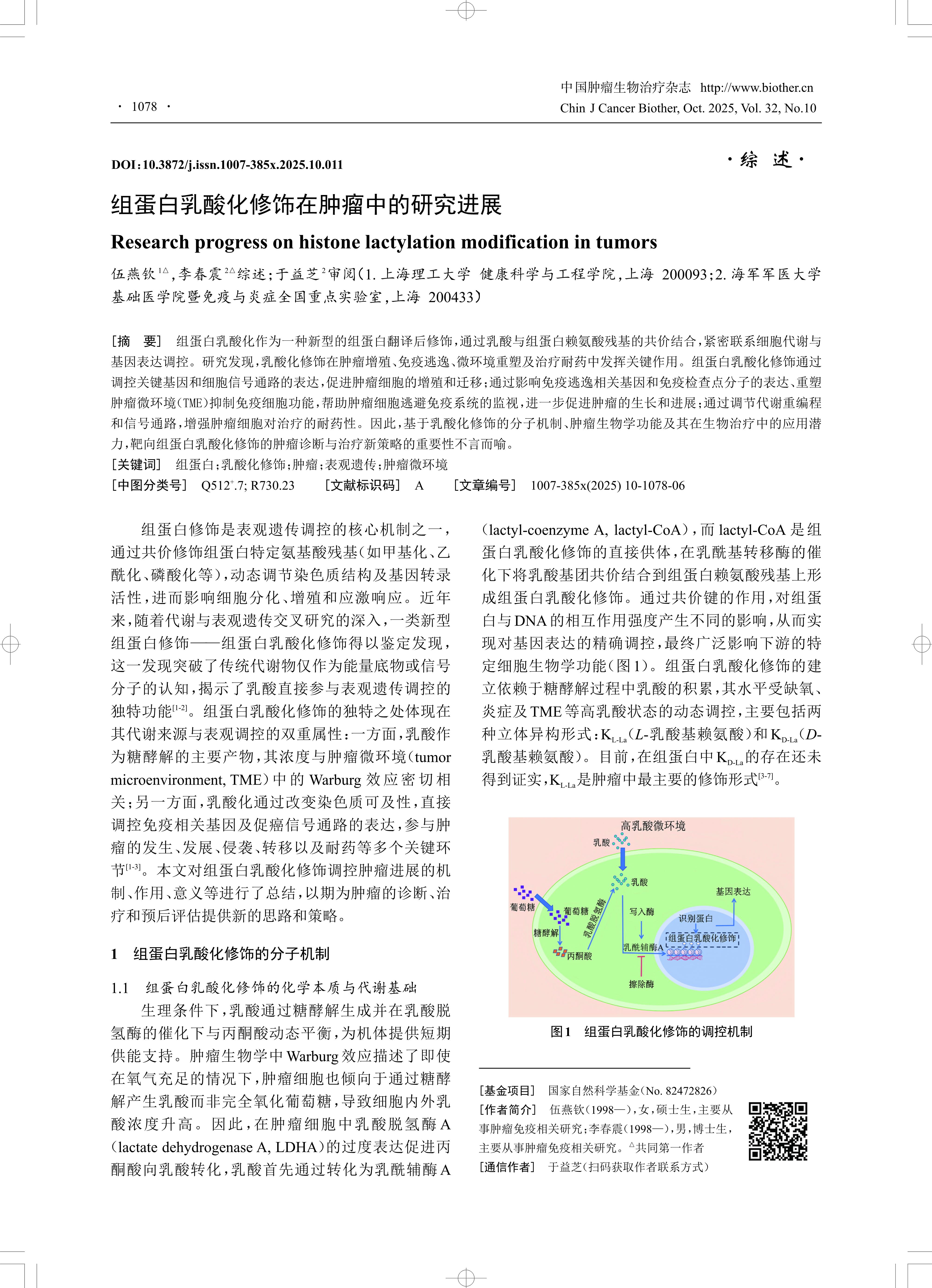 [摘 要] 组蛋白乳酸化作为一种新型的组蛋白翻译后修饰,通过乳酸与组蛋白赖氨酸残基的共价结合,紧密联系细胞代谢与 基因表达调控。研究发现,乳酸化修饰在肿瘤增殖、免疫逃逸、微环境重塑及治疗耐药中发挥关键作用。组蛋白乳酸化修饰通过 调控关键基因和细胞信号通路的表达,促进肿瘤细胞的增殖和迁移;通过影响免疫逃逸相关基因和免疫检查点分子的表达、重塑 肿瘤微环境(TME)抑制免疫细胞功能,帮助肿瘤细胞逃避免疫系统的监视,进一步促进肿瘤的生长和进展;通过调节代谢重编程 和信号通路,增强肿瘤细胞对治疗的耐药性。因此,基于乳酸化修饰的分子机制、肿瘤生物学功能及其在生物治疗中的应用潜 力,靶向组蛋白乳酸化修饰的肿瘤诊断与治疗新策略的重要性不言而喻。