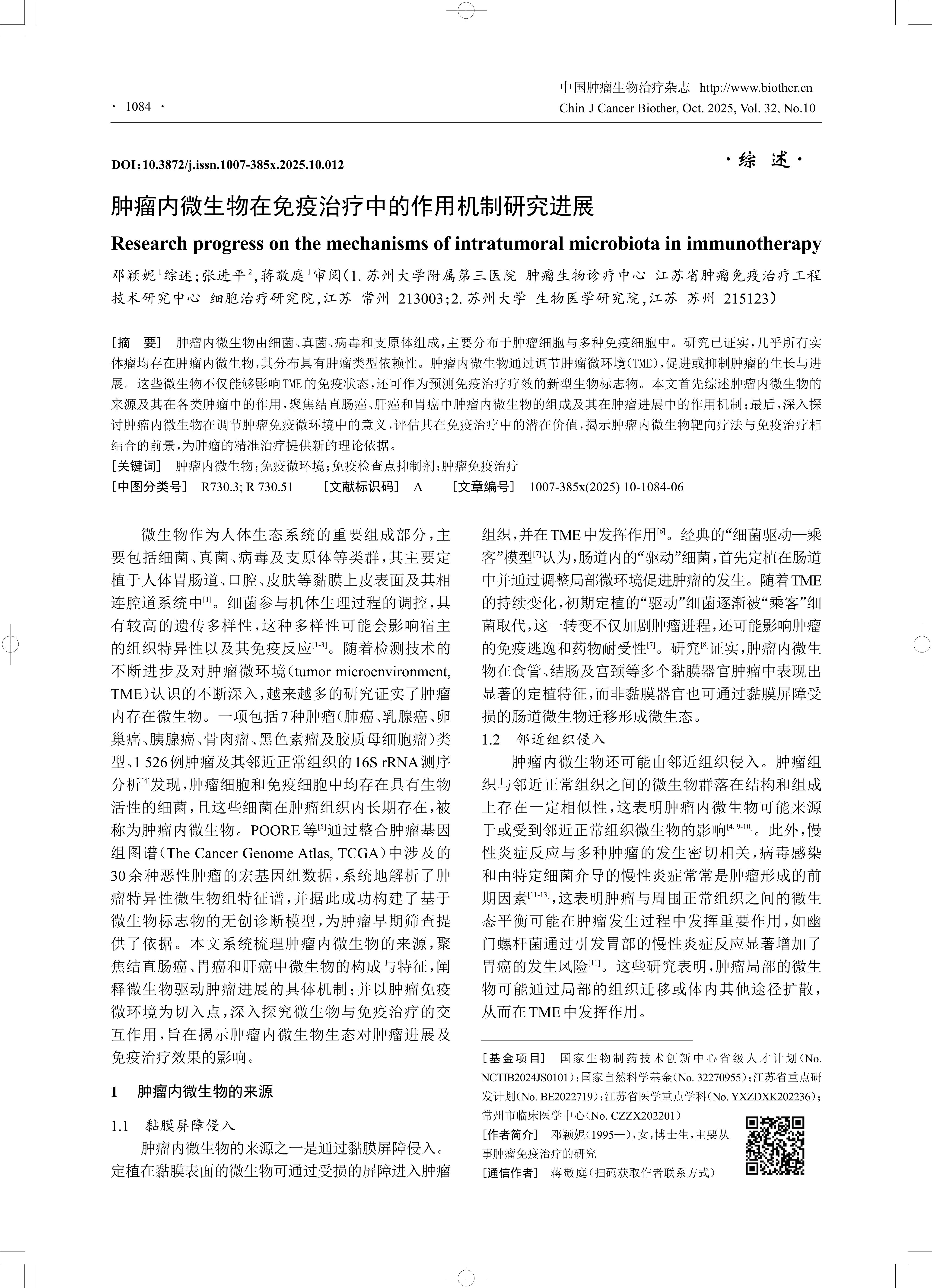 [摘 要] 肿瘤内微生物由细菌、真菌、病毒和支原体组成,主要分布于肿瘤细胞与多种免疫细胞中。研究已证实,几乎所有实 体瘤均存在肿瘤内微生物,其分布具有肿瘤类型依赖性。肿瘤内微生物通过调节肿瘤微环境(TME),促进或抑制肿瘤的生长与进 展。这些微生物不仅能够影响TME的免疫状态,还可作为预测免疫治疗疗效的新型生物标志物。本文首先综述肿瘤内微生物的 来源及其在各类肿瘤中的作用,聚焦结直肠癌、肝癌和胃癌中肿瘤内微生物的组成及其在肿瘤进展中的作用机制;最后,深入探 讨肿瘤内微生物在调节肿瘤免疫微环境中的意义,评估其在免疫治疗中的潜在价值,揭示肿瘤内微生物靶向疗法与免疫治疗相 结合的前景,为肿瘤的精准治疗提供新的理论依据。