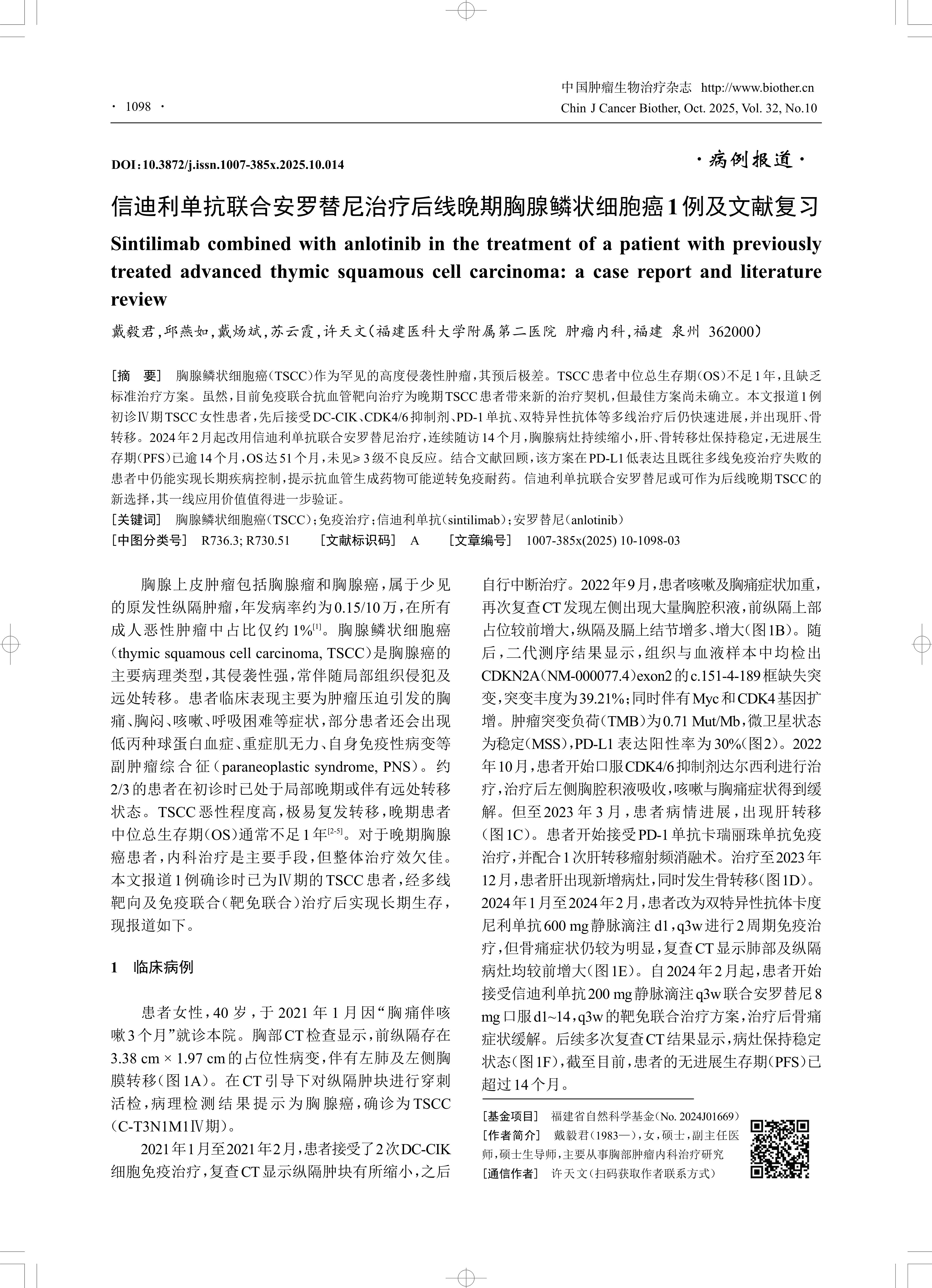 [摘 要] 胸腺鳞状细胞癌(TSCC)作为罕见的高度侵袭性肿瘤,其预后极差。TSCC患者中位总生存期(OS)不足1年,且缺乏 标准治疗方案。虽然,目前免疫联合抗血管靶向治疗为晚期TSCC患者带来新的治疗契机,但最佳方案尚未确立。本文报道1例 初诊Ⅳ期TSCC女性患者,先后接受DC-CIK、CDK4/6抑制剂、PD-1单抗、双特异性抗体等多线治疗后仍快速进展,并出现肝、骨 转移。2024年2月起改用信迪利单抗联合安罗替尼治疗,连续随访14个月,胸腺病灶持续缩小,肝、骨转移灶保持稳定,无进展生 存期(PFS)已逾14个月,OS达51个月,未见≥ 3级不良反应。结合文献回顾,该方案在PD-L1低表达且既往多线免疫治疗失败的 患者中仍能实现长期疾病控制,提示抗血管生成药物可能逆转免疫耐药。信迪利单抗联合安罗替尼或可作为后线晚期TSCC的 新选择,其一线应用价值值得进一步验证。