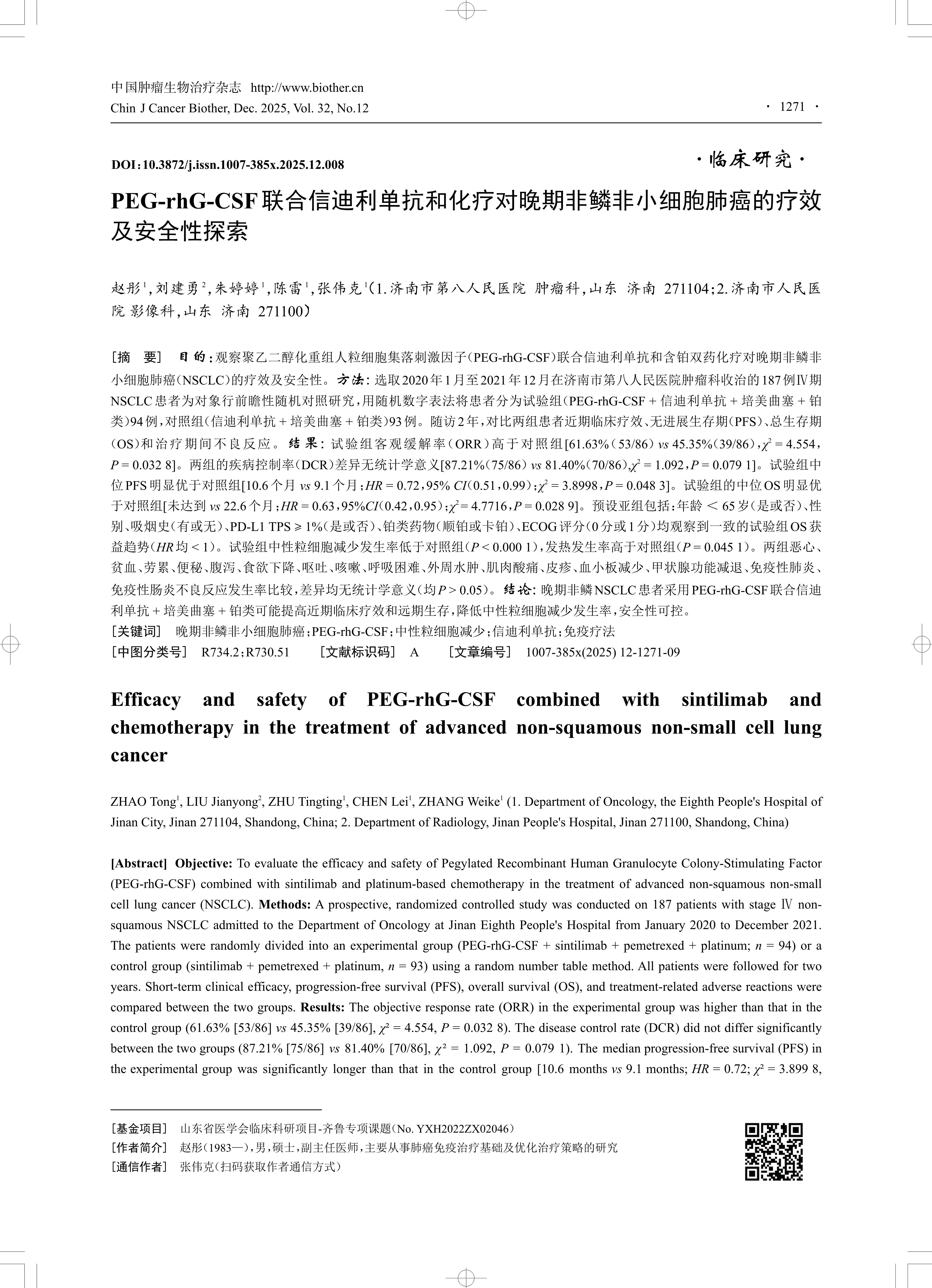 [Abstract] Objective: To evaluate the efficacy and safety of Pegylated Recombinant Human Granulocyte Colony-Stimulating Factor (PEG-rhG-CSF) combined with sintilimab and platinum-based chemotherapy in the treatment of advanced non-squamous non-small cell lung cancer (NSCLC). Methods: A prospective, randomized controlled study was conducted on 187 patients with stage Ⅳ nonsquamous NSCLC admitted to the Department of Oncology at Jinan Eighth People's Hospital from January 2020 to December 2021. The patients were randomly divided into an experimental group (PEG-rhG-CSF + sintilimab + pemetrexed + platinum; n = 94) or a control group (sintilimab + pemetrexed + platinum, n = 93) using a random number table method. All patients were followed for two years. Short-term clinical efficacy, progression-free survival (PFS), overall survival (OS), and treatment-related adverse reactions were compared between the two groups. Results: The objective response rate (ORR) in the experimental group was higher than that in the control group (61.63% [53/86] vs 45.35% [39/86], χ2 = 4.554, P = 0.032 8). The disease control rate (DCR) did not differ significantly between the two groups (87.21% [75/86] vs 81.40% [70/86], χ2 = 1.092, P = 0.079 1). The median progression-free survival (PFS) in the experimental group was significantly longer than that in the control group [10.6 months vs 9.1 months; HR = 0.72; χ2 = 3.899 8, P = 0.048 3]. The median overall survival (OS) in the experimental group was also significantly longer than that in the control group [not reached vs 22.6 months; HR = 0.63; χ2 = 4.7716, P = 0.028 9]. Consistent OS benefits (all HR < 1) were observed in the predefined subgroup analyses, including age < 65 years (yes or no), gender, smoking history (yes or no), PD-L1 TPS ≥ 1% (yes or no), platinumbased drugs (cisplatin or carboplatin), and ECOG PS score (0 or 1). The incidence of neutropenia was significantly lower in the experimental group than that in the control group (P < 0.000 1), while the incidence of fever was significantly higher (P = 0.045 1). No significant differences were observed between the two groups in nausea, anemia, fatigue, constipation, diarrhea, decreased appetite, vomiting, cough, dyspnea, peripheral edema, muscle pain, rash, thrombocytopenia, hypothyroidism, immune pneumonitis, or immunerelated colitis (all P > 0.05). Conclusion: The combination of PEG-rhG-CSF with sintilimab, pemetrexed, and platinum-based chemotherapy in advanced non-squamous NSCLC patients may improve short-term clinical efficacy and long-term survival, reduce the incidence of neutropenia, and maintain controllable safety.