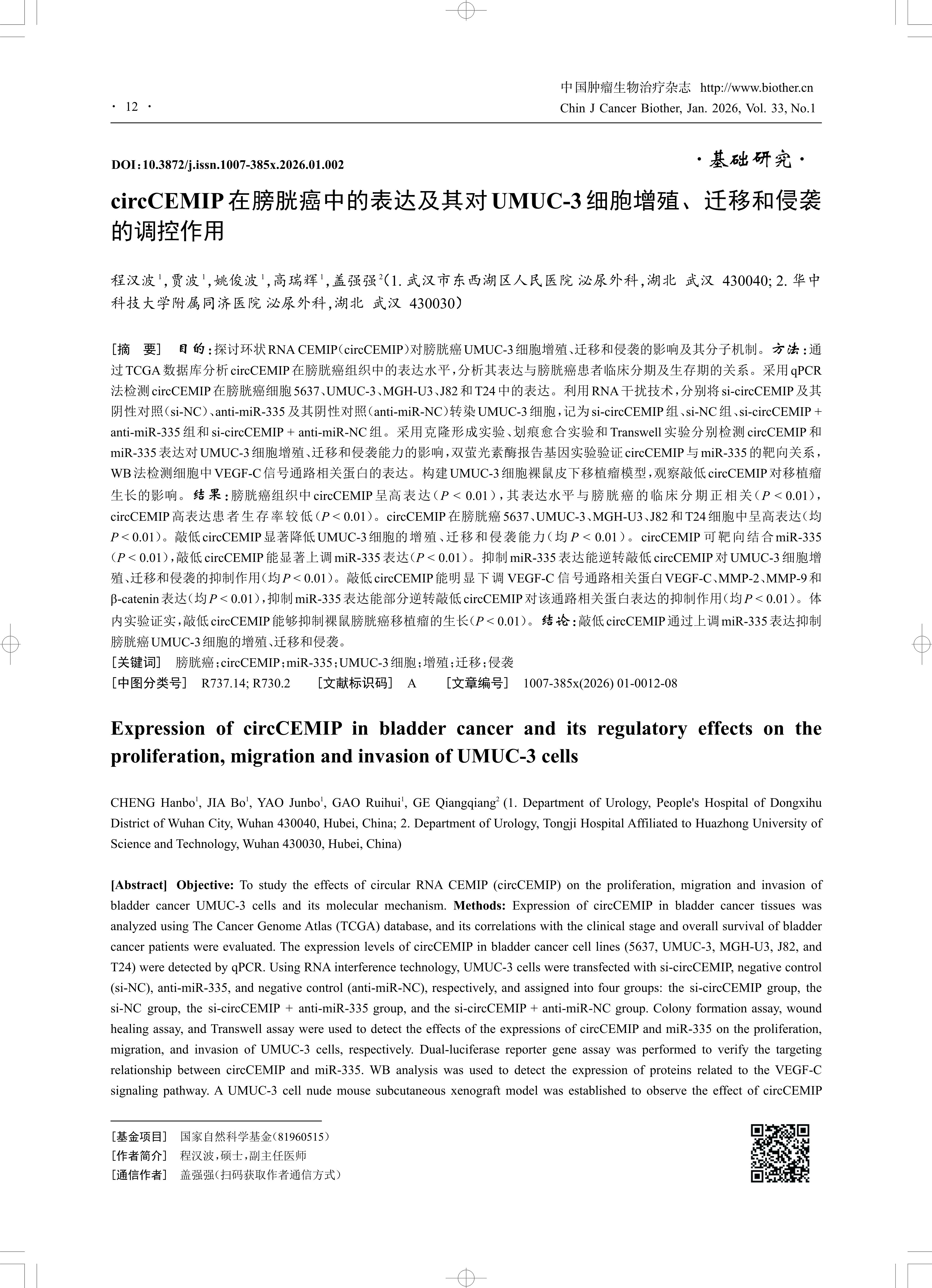 [摘 要] 目的:探讨环状RNA CEMIP(circCEMIP)对膀胱癌UMUC-3细胞增殖、迁移和侵袭的影响及其分子机制。方法:通 过TCGA数据库分析circCEMIP在膀胱癌组织中的表达水平,分析其表达与膀胱癌患者临床分期及生存期的关系。采用qPCR 法检测circCEMIP在膀胱癌细胞5637、UMUC-3、MGH-U3、J82和T24中的表达。利用RNA干扰技术,分别将si-circCEMIP及其 阴性对照(si-NC)、anti-miR-335及其阴性对照(anti-miR-NC)转染UMUC-3细胞,记为si-circCEMIP组、si-NC组、si-circCEMIP + anti-miR-335 组和 si-circCEMIP + anti-miR-NC 组。采用克隆形成实验、划痕愈合实验和 Transwell 实验分别检测 circCEMIP 和 miR-335表达对UMUC-3细胞增殖、迁移和侵袭能力的影响,双萤光素酶报告基因实验验证circCEMIP与miR-335的靶向关系, WB法检测细胞中VEGF-C信号通路相关蛋白的表达。构建UMUC-3细胞裸鼠皮下移植瘤模型,观察敲低circCEMIP对移植瘤 生长的影响。结果:膀胱癌组织中circCEMIP呈高表达(P < 0.01),其表达水平与膀胱癌的临床分期正相关(P < 0.01), circCEMIP高表达患者生存率较低(P < 0.01)。circCEMIP在膀胱癌5637、UMUC-3、MGH-U3、J82和T24细胞中呈高表达(均 P < 0.01)。敲低circCEMIP显著降低UMUC-3细胞的增殖、迁移和侵袭能力(均 P < 0.01)。circCEMIP 可靶向结合miR-335 (P < 0.01),敲低circCEMIP能显著上调miR-335表达(P < 0.01)。抑制miR-335表达能逆转敲低circCEMIP对UMUC-3细胞增 殖、迁移和侵袭的抑制作用(均P < 0.01)。敲低circCEMIP能明显下调 VEGF-C 信号通路相关蛋白VEGF-C、MMP-2、MMP-9和 β-catenin表达(均P < 0.01),抑制miR-335表达能部分逆转敲低circCEMIP对该通路相关蛋白表达的抑制作用(均P < 0.01)。体 内实验证实,敲低circCEMIP能够抑制裸鼠膀胱癌移植瘤的生长(P < 0.01)。结论:敲低circCEMIP通过上调miR-335表达抑制 膀胱癌UMUC-3细胞的增殖、迁移和侵袭。