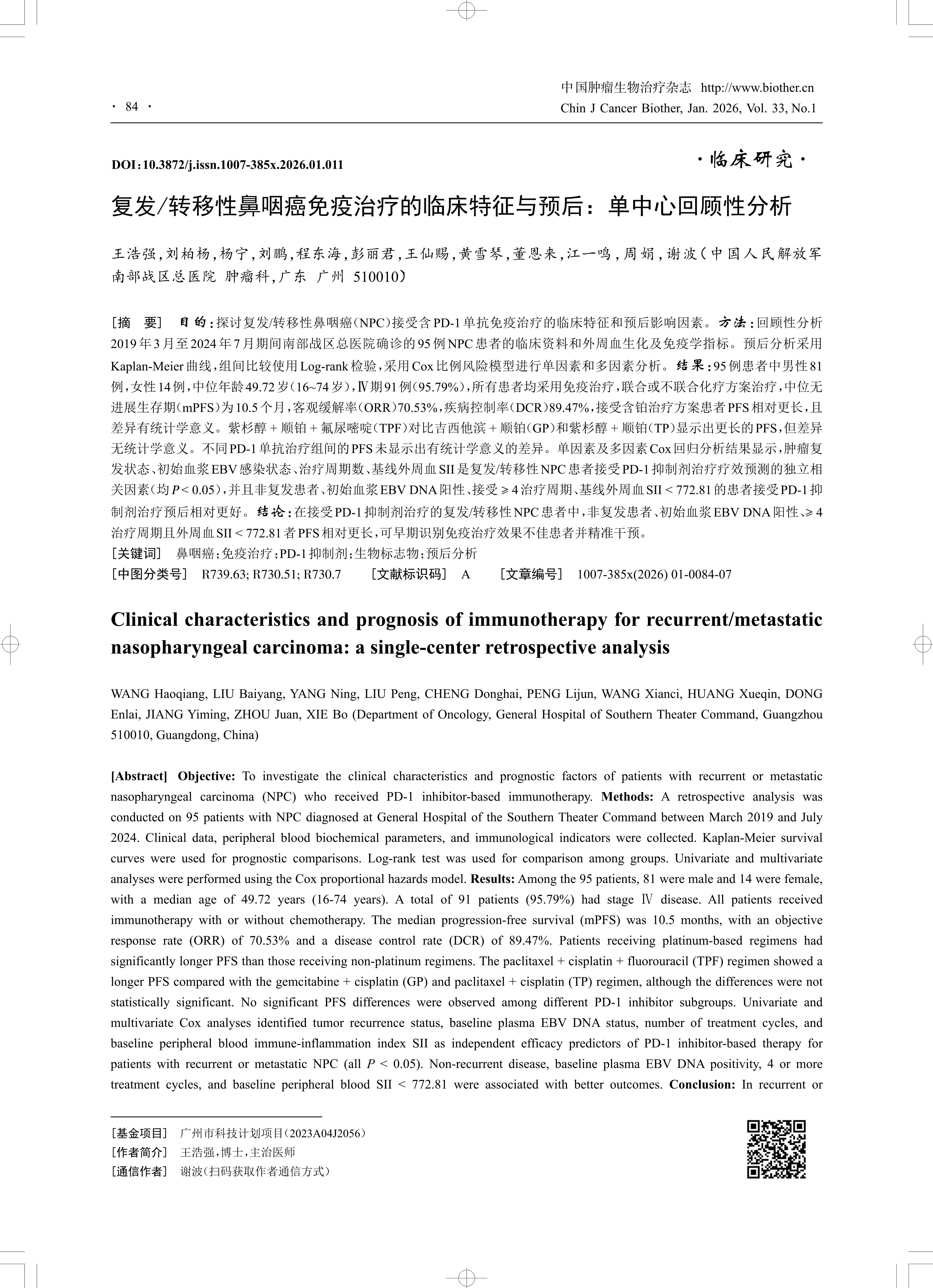 [Abstract] Objective: To investigate the clinical characteristics and prognostic factors of patients with recurrent or metastatic nasopharyngeal carcinoma (NPC) who received PD-1 inhibitor-based immunotherapy. Methods: A retrospective analysis was conducted on 95 patients with NPC diagnosed at General Hospital of the Southern Theater Command between March 2019 and July 2024. Clinical data, peripheral blood biochemical parameters, and immunological indicators were collected. Kaplan-Meier survival curves were used for prognostic comparisons. Log-rank test was used for comparison among groups. Univariate and multivariate analyses were performed using the Cox proportional hazards model. Results: Among the 95 patients, 81 were male and 14 were female, with a median age of 49.72 years (16-74 years). A total of 91 patients (95.79%) had stage Ⅳ disease. All patients received immunotherapy with or without chemotherapy. The median progression-free survival (mPFS) was 10.5 months, with an objective response rate (ORR) of 70.53% and a disease control rate (DCR) of 89.47%. Patients receiving platinum-based regimens had significantly longer PFS than those receiving non-platinum regimens. The paclitaxel + cisplatin + fluorouracil (TPF) regimen showed a longer PFS compared with the gemcitabine + cisplatin (GP) and paclitaxel + cisplatin (TP) regimen, although the differences were not statistically significant. No significant PFS differences were observed among different PD-1 inhibitor subgroups. Univariate and multivariate Cox analyses identified tumor recurrence status, baseline plasma EBV DNA status, number of treatment cycles, and baseline peripheral blood immune-inflammation index SII as independent efficacy predictors of PD-1 inhibitor-based therapy for patients with recurrent or metastatic NPC (all P < 0.05). Non-recurrent disease, baseline plasma EBV DNA positivity, 4 or more treatment cycles, and baseline peripheral blood SII < 772.81 were associated with better outcomes. Conclusion: In recurrent or metastatic NPC patients treated with PD-1 inhibitors, non-recurrent disease, baseline EBV DNA positivity, 4 or more treatment cycles, and peripheral blood SII < 772.81 were associated with prolonged PFS. These factors may help early identification of patients with suboptimal immunotherapy responses and enable timely individualized intervention.