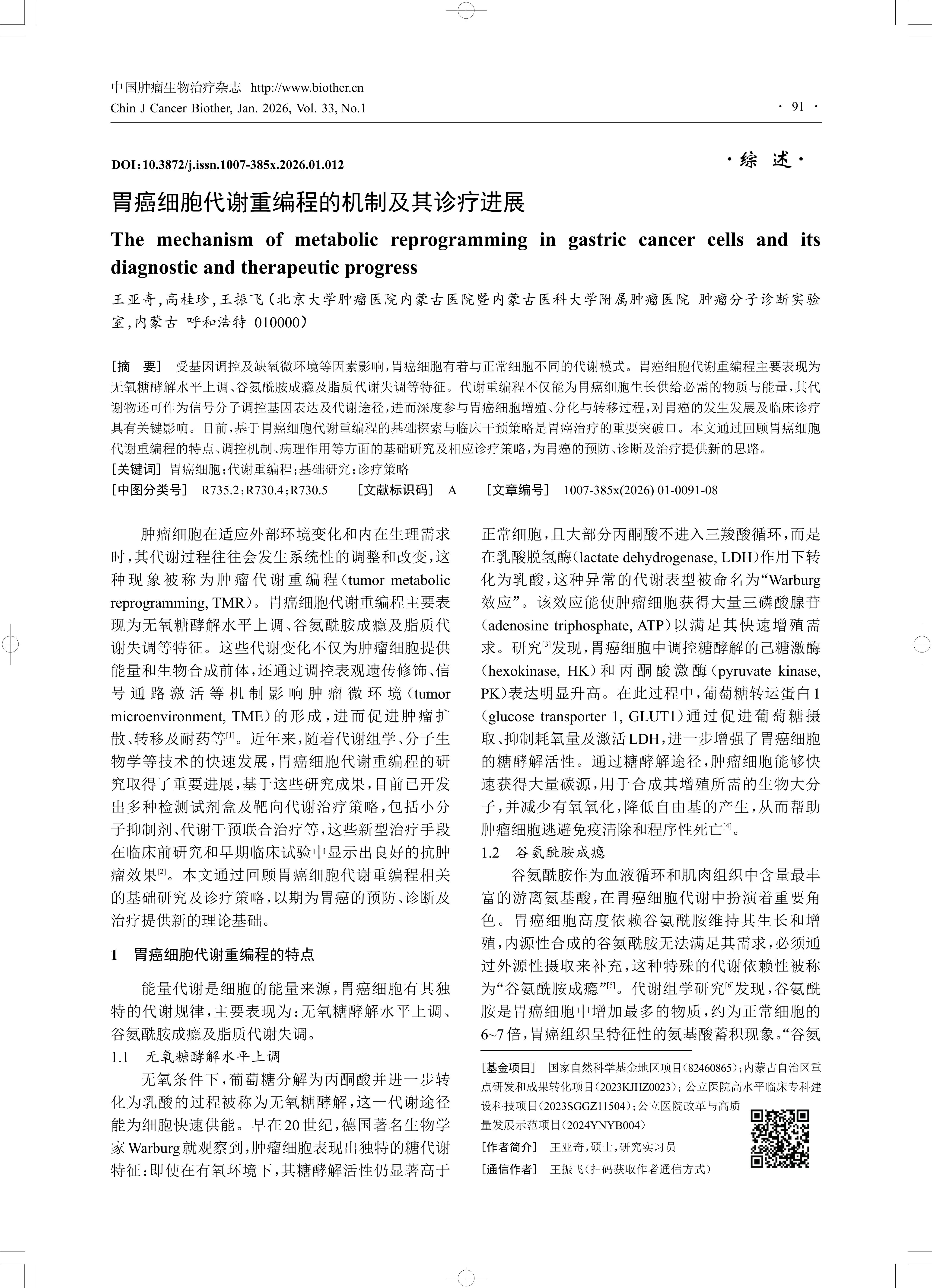 [摘 要] 受基因调控及缺氧微环境等因素影响,胃癌细胞有着与正常细胞不同的代谢模式。胃癌细胞代谢重编程主要表现为 无氧糖酵解水平上调、谷氨酰胺成瘾及脂质代谢失调等特征。代谢重编程不仅能为胃癌细胞生长供给必需的物质与能量,其代 谢物还可作为信号分子调控基因表达及代谢途径,进而深度参与胃癌细胞增殖、分化与转移过程,对胃癌的发生发展及临床诊疗 具有关键影响。目前,基于胃癌细胞代谢重编程的基础探索与临床干预策略是胃癌治疗的重要突破口。本文通过回顾胃癌细胞 代谢重编程的特点、调控机制、病理作用等方面的基础研究及相应诊疗策略,为胃癌的预防、诊断及治疗提供新的思路。